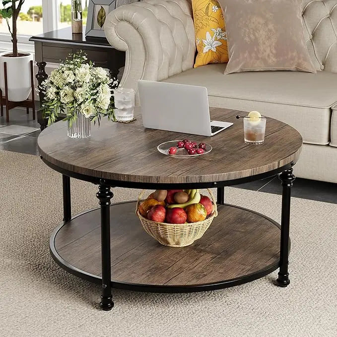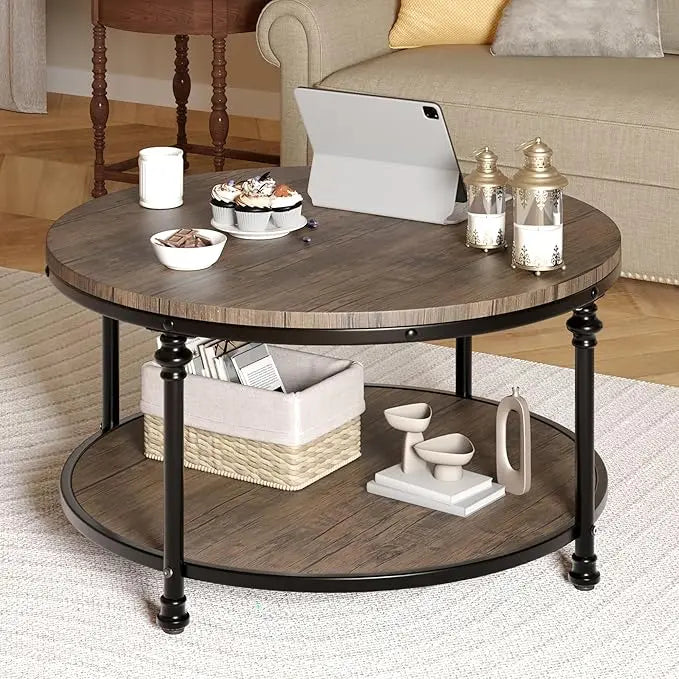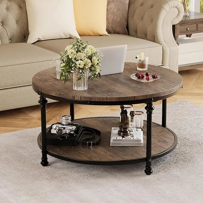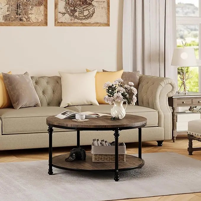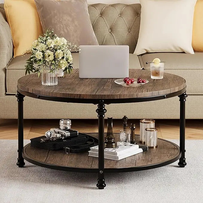 GAOMON Round Coffee Table Living Room 34.25in Rustic Circle Center Table with Storage Shelf 2-Tier Modern Wood Coffee Table Metal Frame, Easy Assembly(Light Walnut)