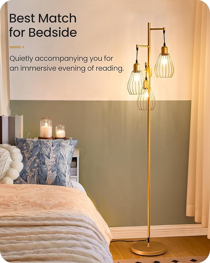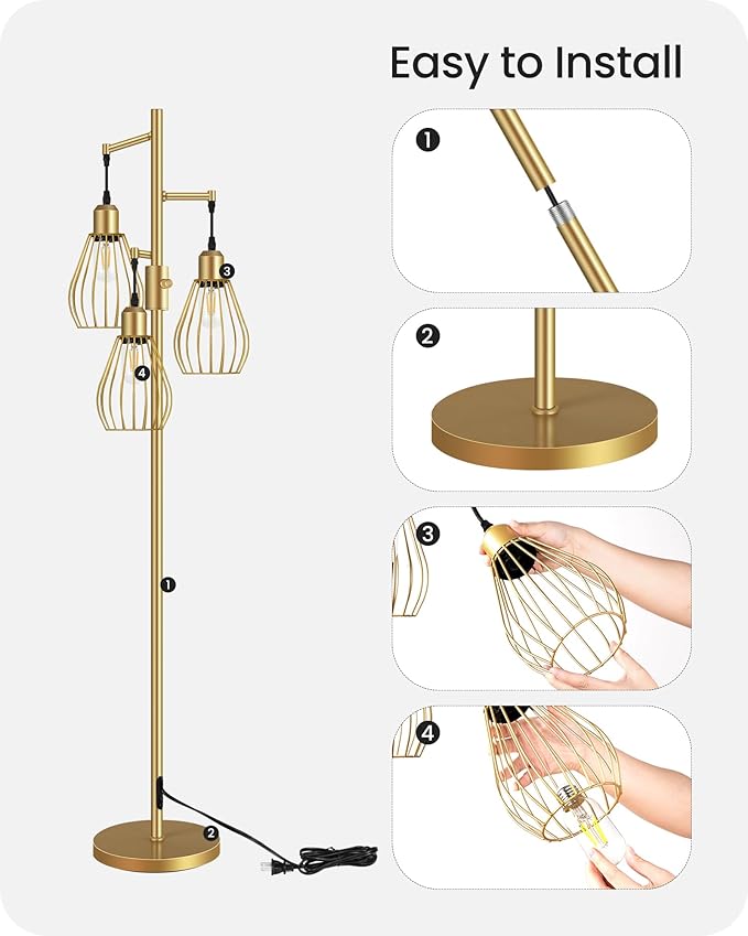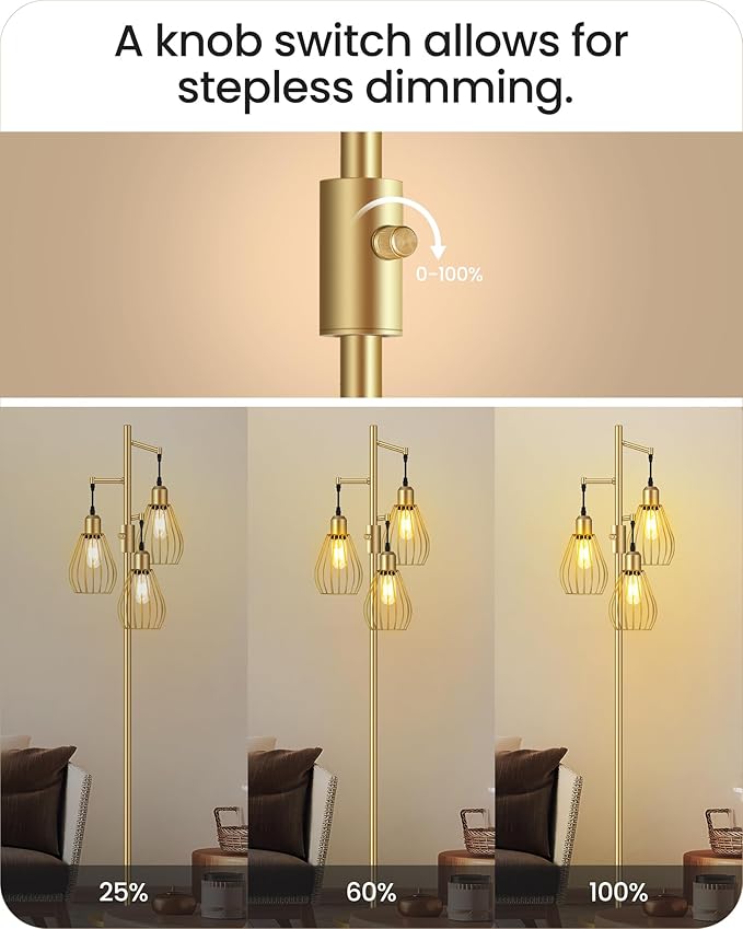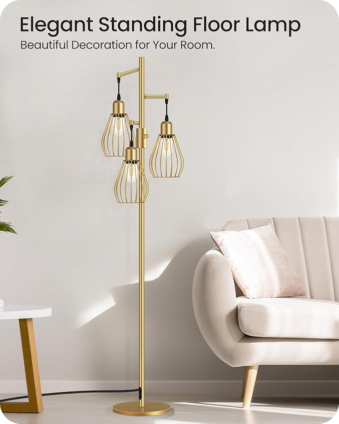Farmhouse Dimmable Floor Lamp, Industrial Tall Standing Tree Lamp with 3 Elegant Teardrop Cage Heads, 4W 3 LED Bulbs Included, Rustic Standing Lamp for Living Room, Bedroom, Gold D02LD05