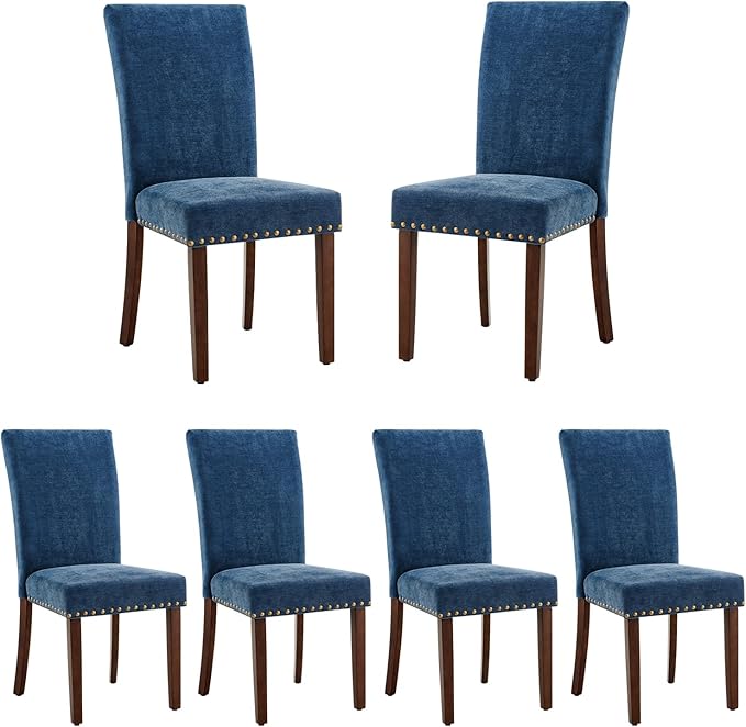 COLAMY Upholstered Parsons Dining Chairs Set of 6, Fabric Dining Room Kitchen Side Chair with Nailhead Trim and Wood Legs - Dark Blue