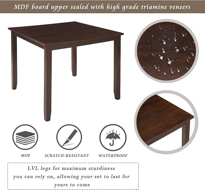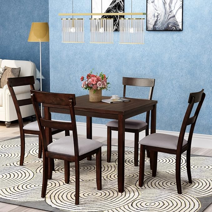 5 Piece Dining Set, Industrial Wooden Table and 4 Chairs, with High-Density Foam Burlap Upholstered Cushions for Diningroom, Living Room, and Kitchen, Espresso
