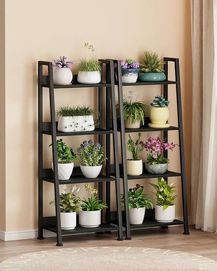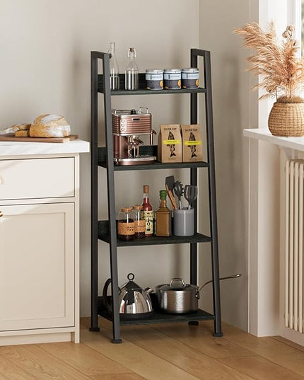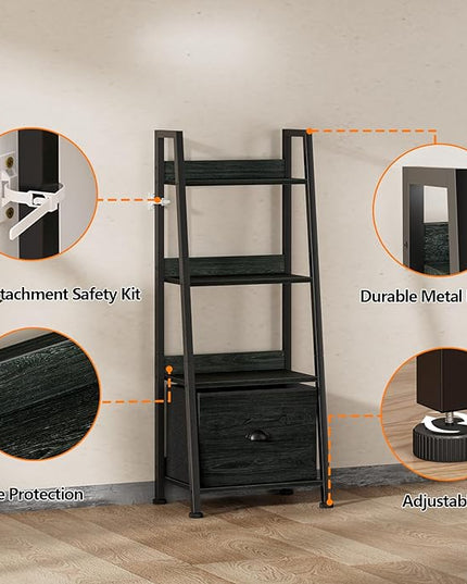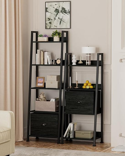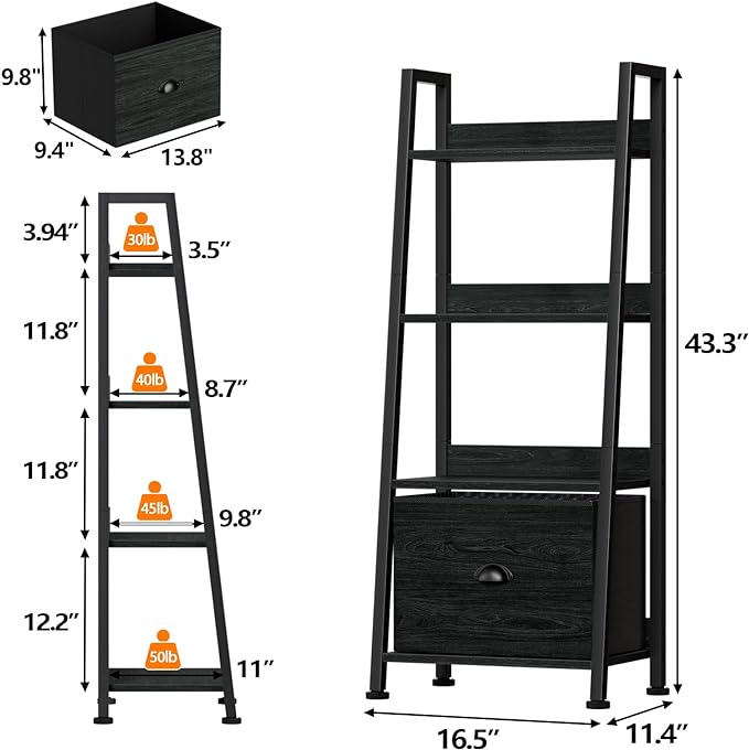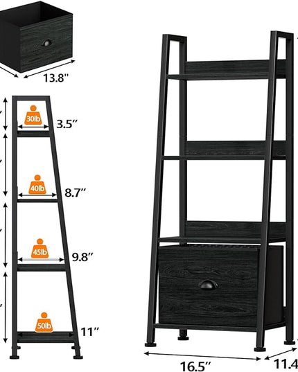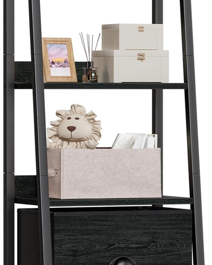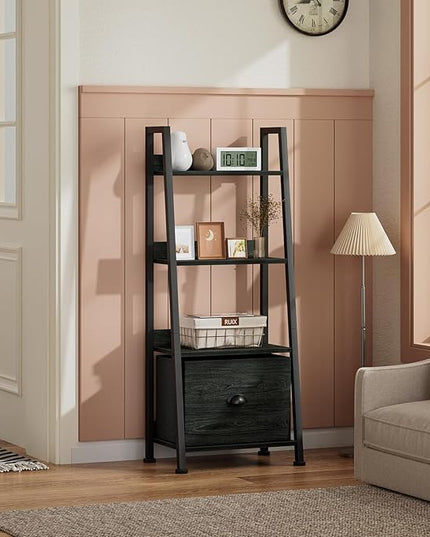 Furologee 4-Tier Ladder Shelf, Ladder Bookshelf with Removable Drawer, Bookcase Storage Rack Organizer, Freestanding Storage Shelves for Living Room, Home Office, Bedroom, Black Oak