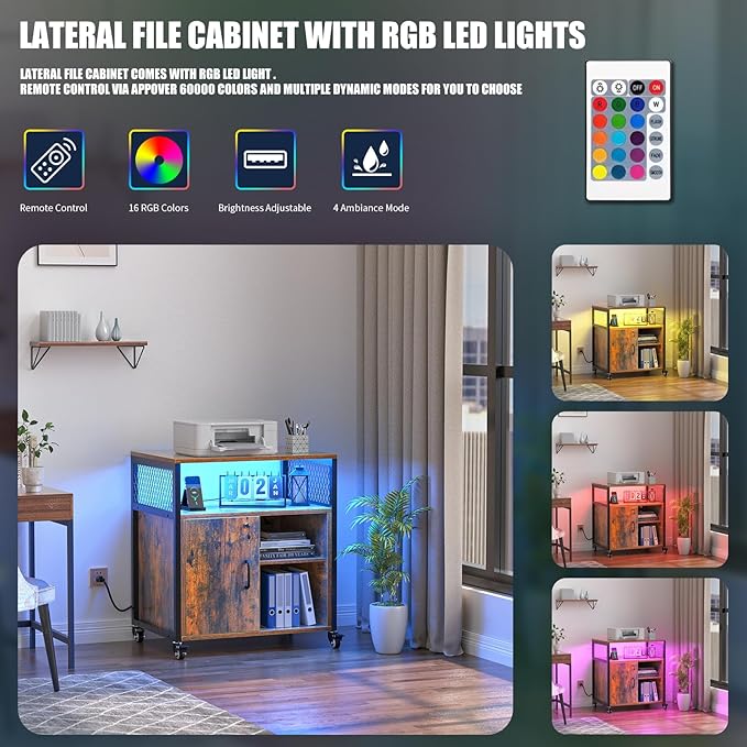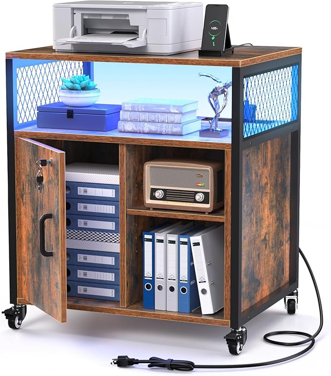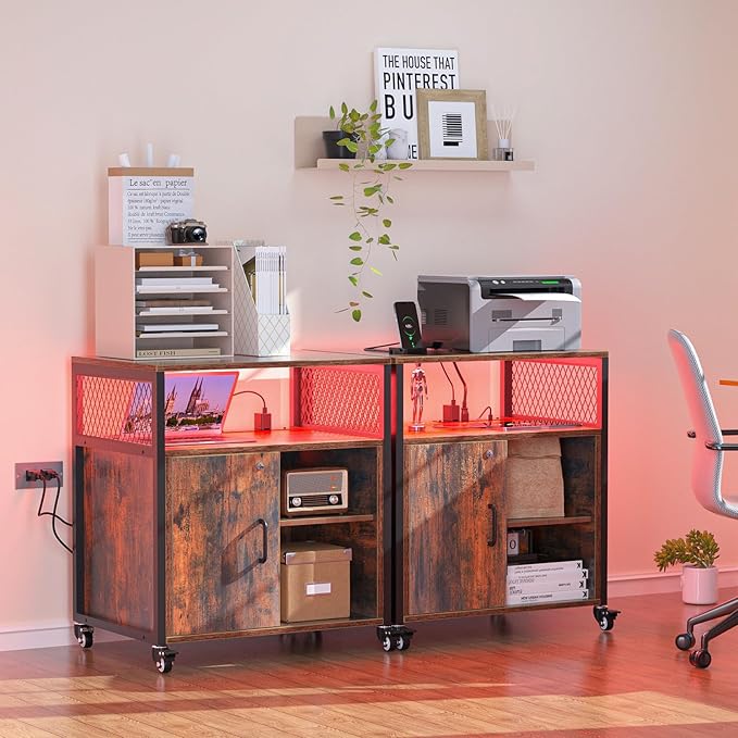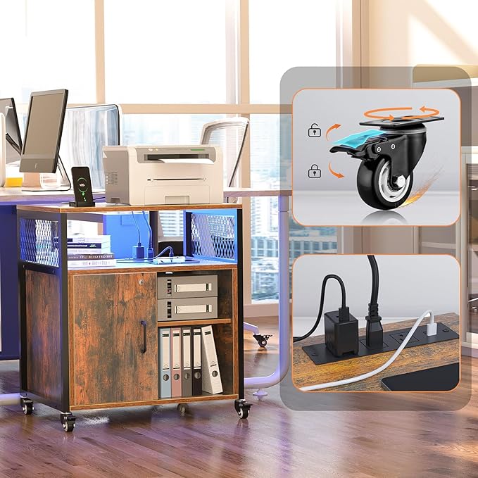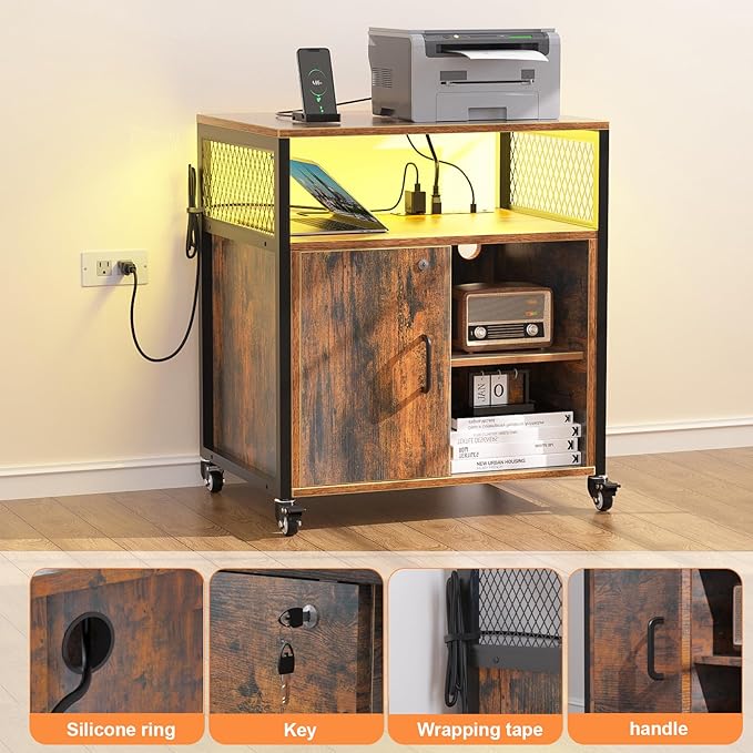 LED Rolling Wheels Filing Cabinet with Lock, File Cabinets with Charging Station, Printer Stand with Storage for Office Home, A4 Letter Size File Folders