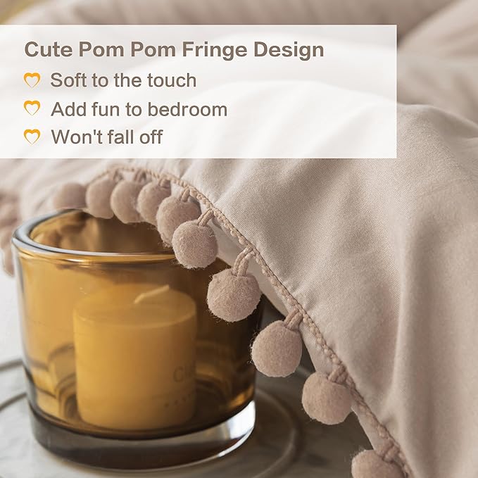 Litanika King Size Comforter Set Taupe,3 Pieces Taupe Boho Pom Pom Lightweight Bed Comforter, All Season Soft Solid Color Bedding Comforter Sets (1 Comforter 104x90 Inch, 2 Pillowcases)