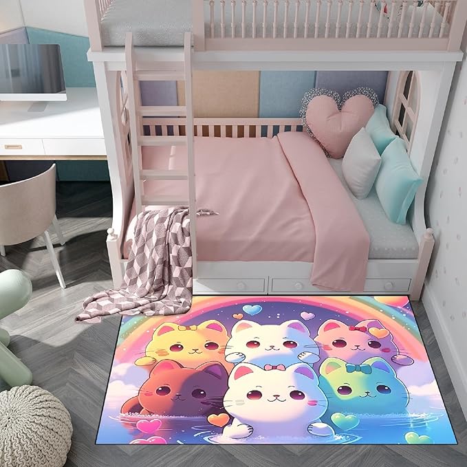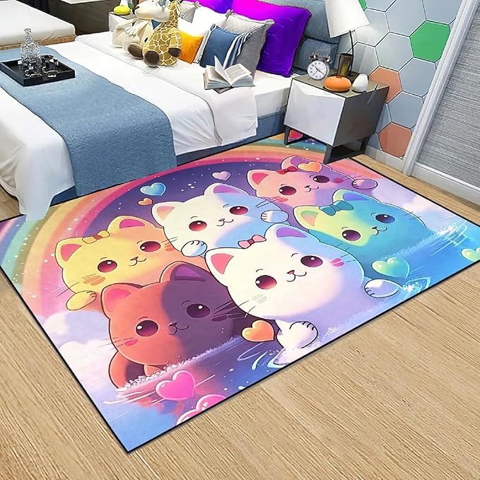 Rainbow Cat Rug for Girls - Colorful Cat Rug for Kids Bedroom Cute Cartoon Cat Pattern Rug Lovely Cat Rugs Room Decor Anime Cat Area Rug, 4.5x6 Feet