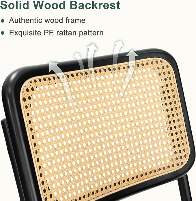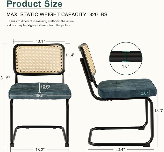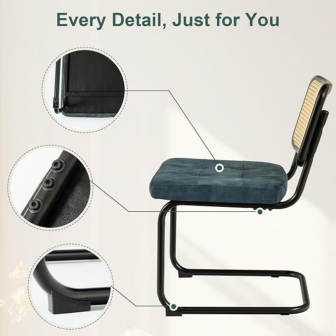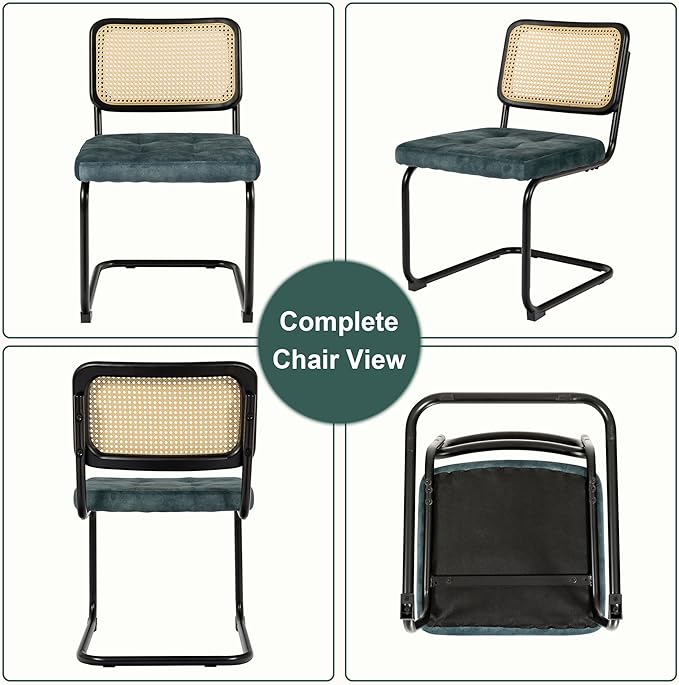 Mid Century Modern Dining Chairs Set of 2, Rattan Cantilever Kitchen Chairs, Dining Room Chairs Blue Upholstered, Solid Wood Cane Back, Black Stainless Chrome Base Heavy Duty