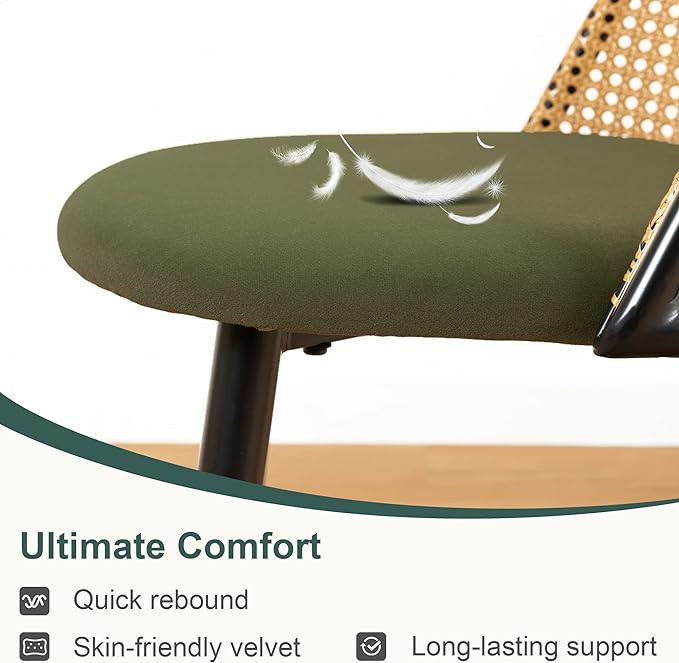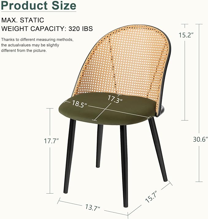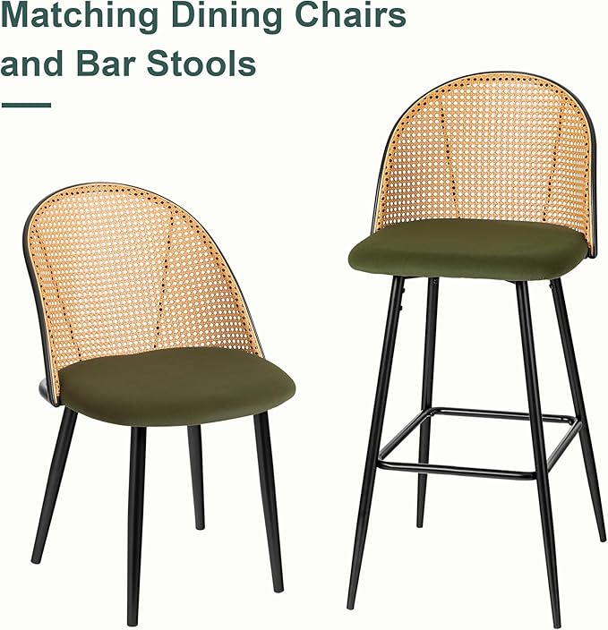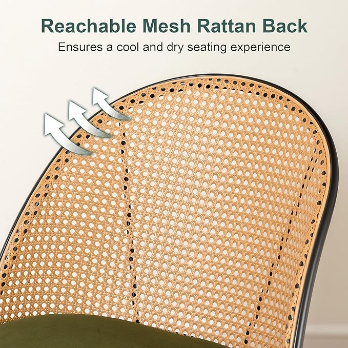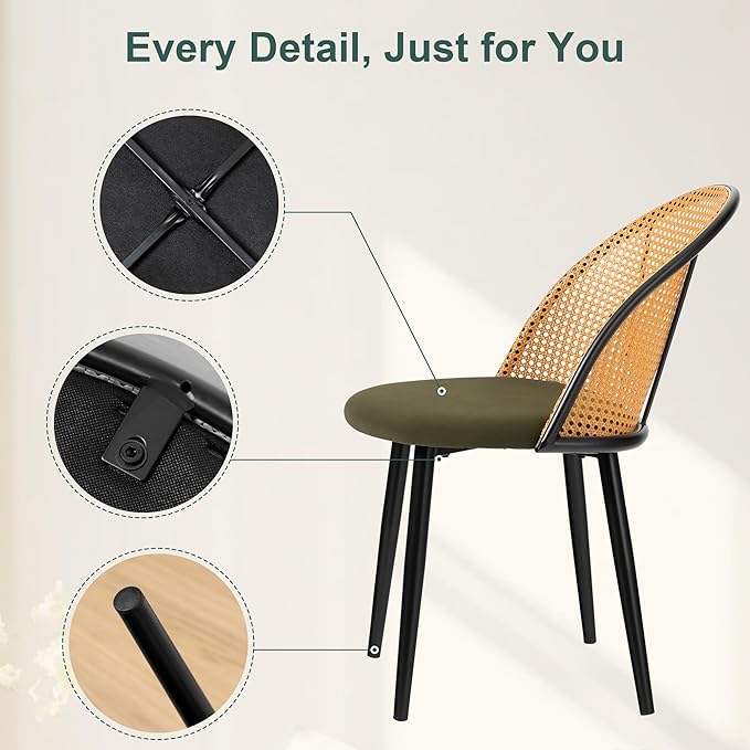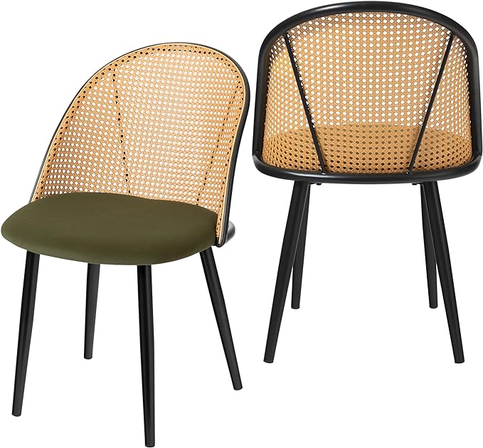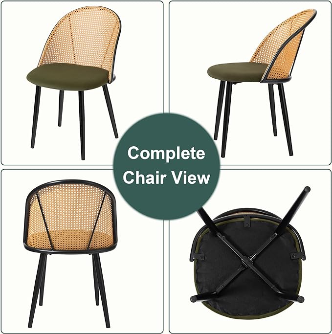 Mid Century Modern Dining Chairs Set of 2, Olive Green Dining Chairs, Kitchen Chairs with Full Rattan Back and Metal Tapered Legs, Kitchen & Dining Room Chairs