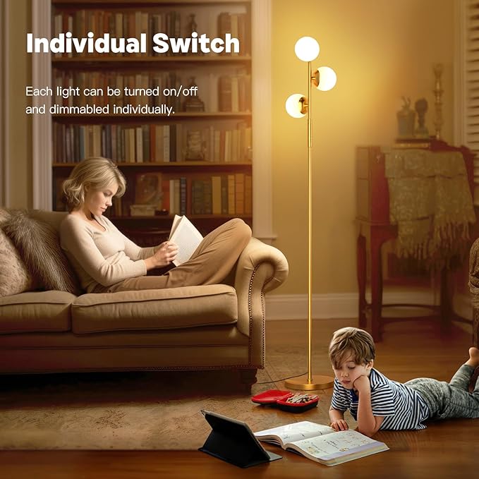 LED Floor Lamp for Living Room, 3 Globe Bright Standing Lamp with Remote, 4 Color Temterapure Dimmable Bedroom Lamp Modern Floor Lamp for Living Room Bedroom Office, 30W, 2700-6500K, Gold