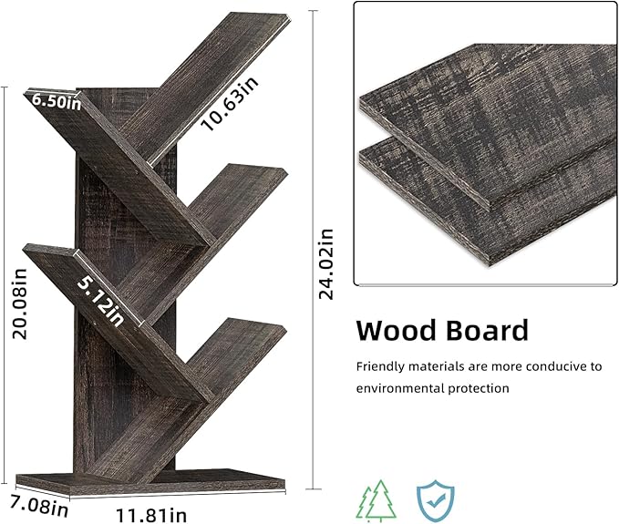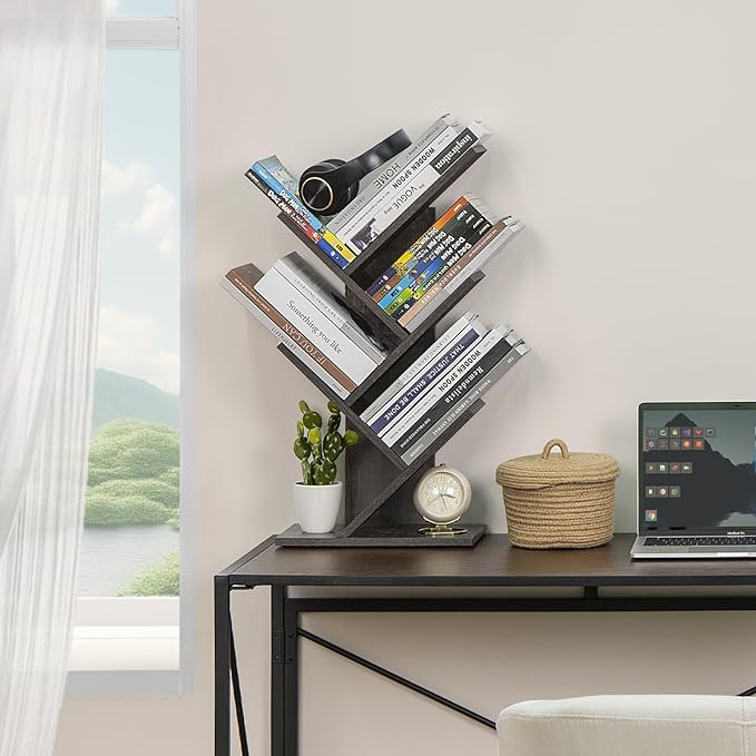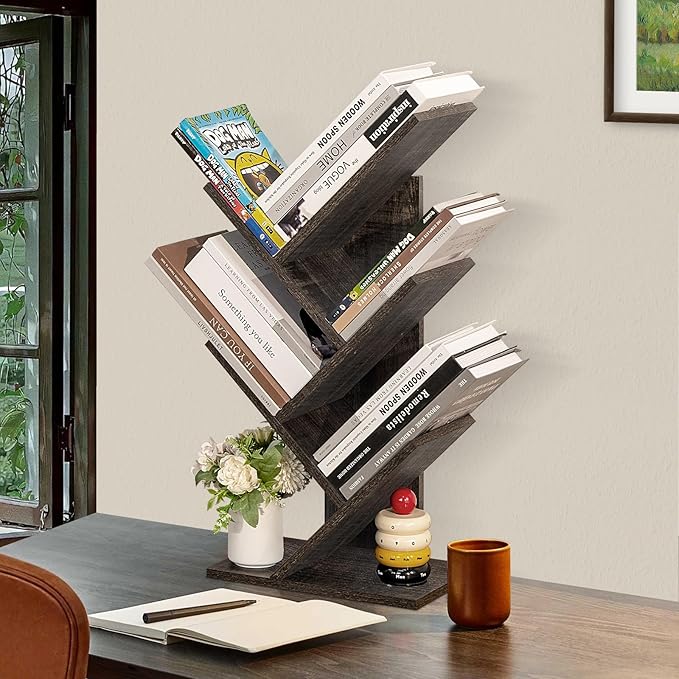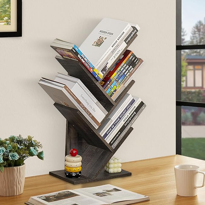 5 Tier Tree Book Shelf, Small Desktop Bookshelf with Storage Organizer, Wood Bookcase, Desk Display Bookshelves, Floor Standing Organizer Bookcases for Living Room,Bedroom,Office-Dark Grey
