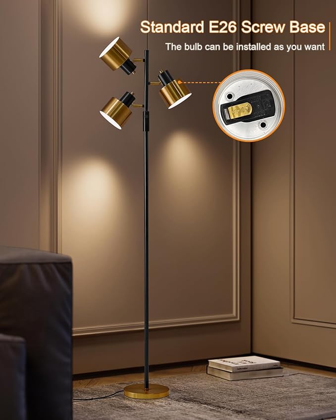 OYEARS Floor Lamp for Living Room Bright Lighting Tall Modern Industrial Vintage Standing Corner Lamps LED Metal Light Office Bedroom Study Gold Black White Matte Accent (3-Light, Gold)