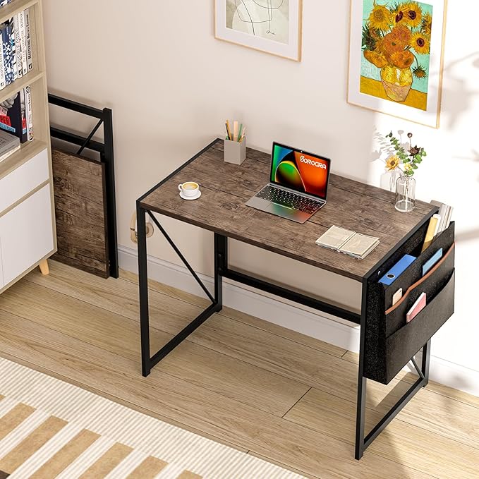Folding Desk, Small Foldable Desk 31.5 Inch for Small Space, Computer Table Home Office Writing Desk with Storage Bag Headphone Hook, Easy Assembly, Brown