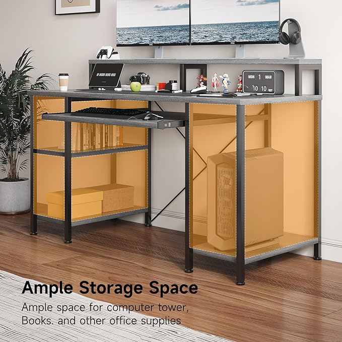 VERMESS Computer Desk- 48 Inch Home Office Desk with Keyboard Tray, 47" Gaming Desk with Full Monitor Stand & Storage Shelves & CPU Stand, Modern Study Writing Table with Shelf for Storage, Gray Oak