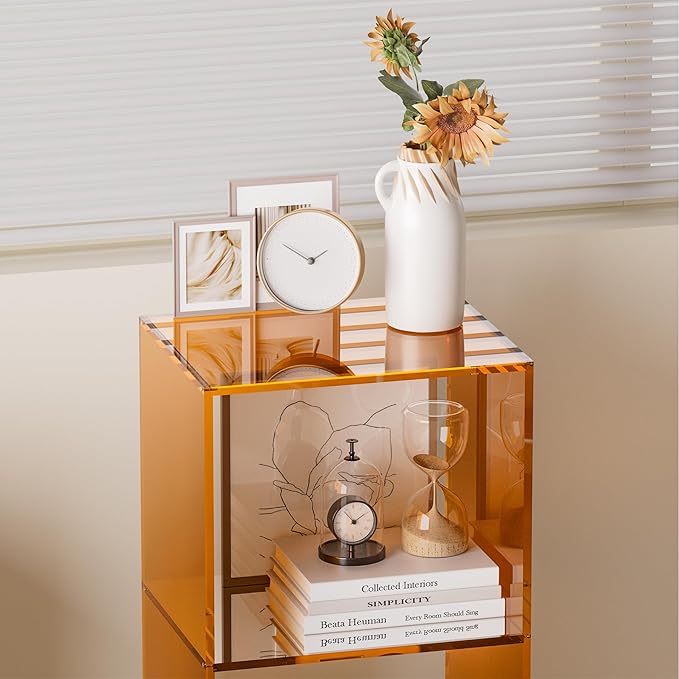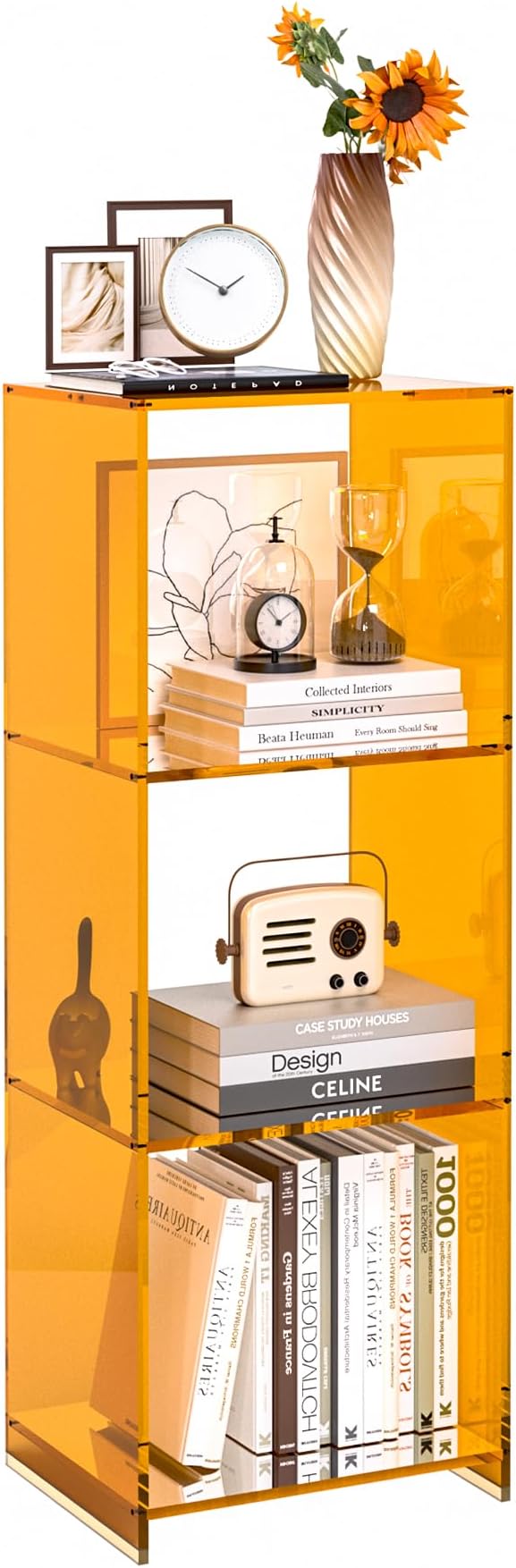 Acrylic Bookcase, 3 Tier Clear Floor Standing Bookshelf, 31.5 inch Tall Display Cube Storage Shelf Home Decor Furniture for Home, Office, Living Room, Bedroom - Transparent Orange