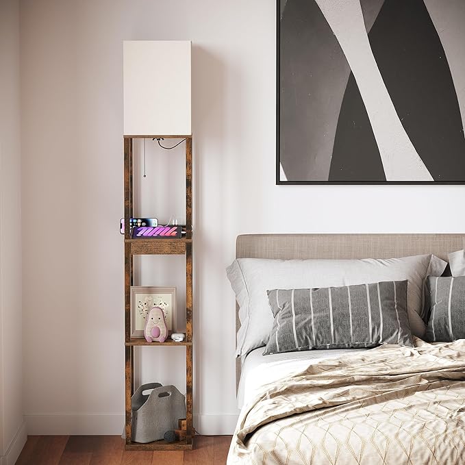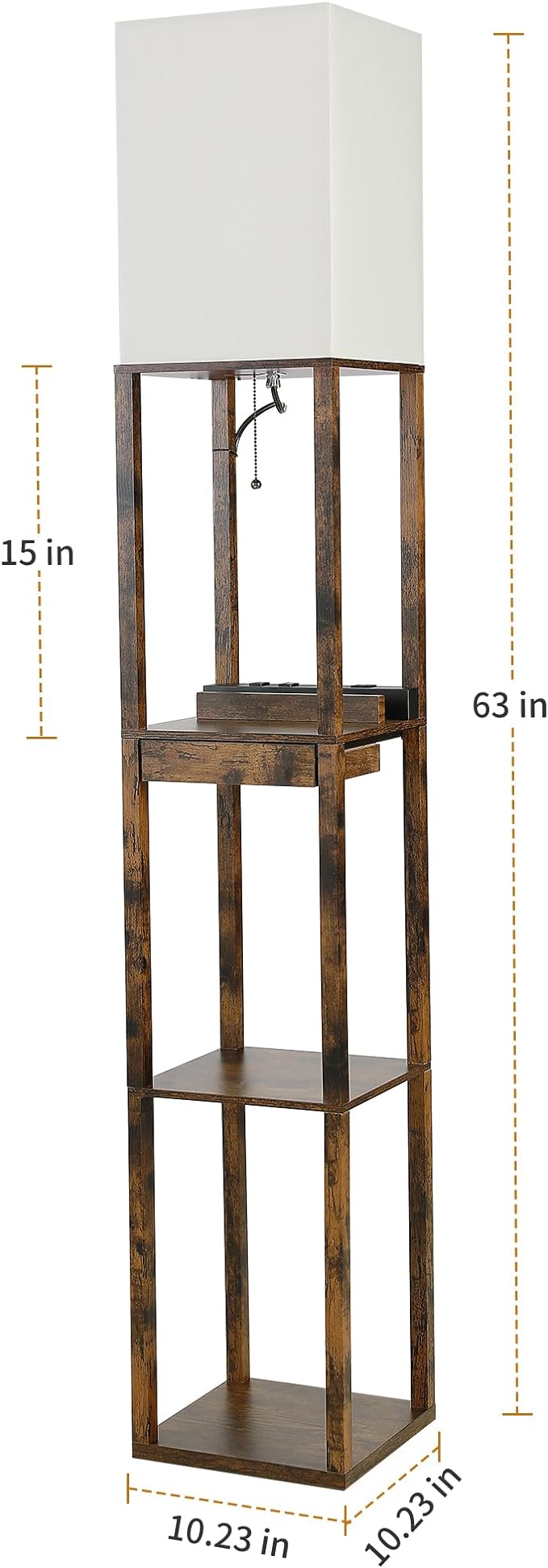 SUNMORY Floor Lamp with Shelves, Modern Dimmable Standing Lamp with Drawer & 2 USB Ports & 2 Power Outlet, Corner Tall Shelf Lamp for Living Room and Bedroom (Rustic Browm)