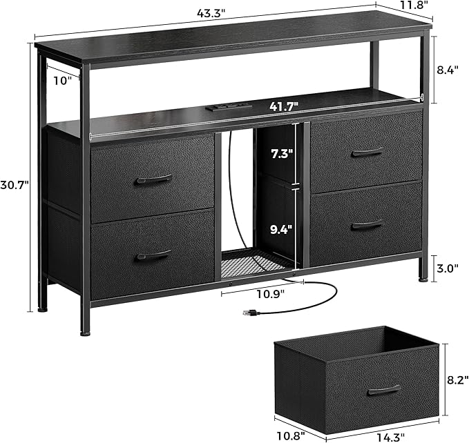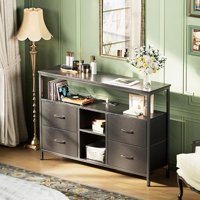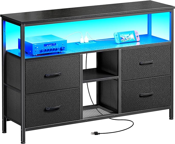 TV Stand Dresser with Power Outlets and LED Lights, 4 Drawers Entertainment Center with Open Shelf, Media Console for 50 43 Inch TV, Dresser with PU Finish, Black