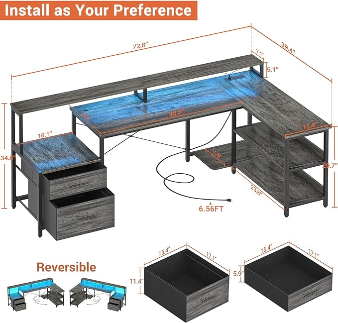 Aheaplus L Shaped Desk with File Drawer, 72.8" Reversible L Shaped Computer Desk with Power Outlet & LED Strip, Gaming Desk with Monitor Stand, Office Desk Corner Desk with Storage Shelf, Grey Oak