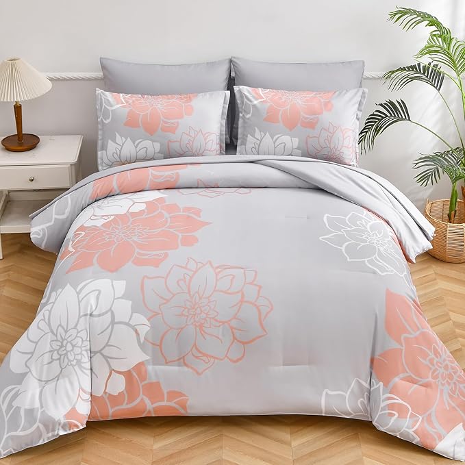 Floral Comforter Set Queen 7 Piece Bed in a Bag Coral Flower Comforter with Sheet Set Soft Micorfiber Bedding Set (1 Comforter,2 Pillow Shams,1 Flat Sheet,1 Fitted Sheet,2 Pillowcases)