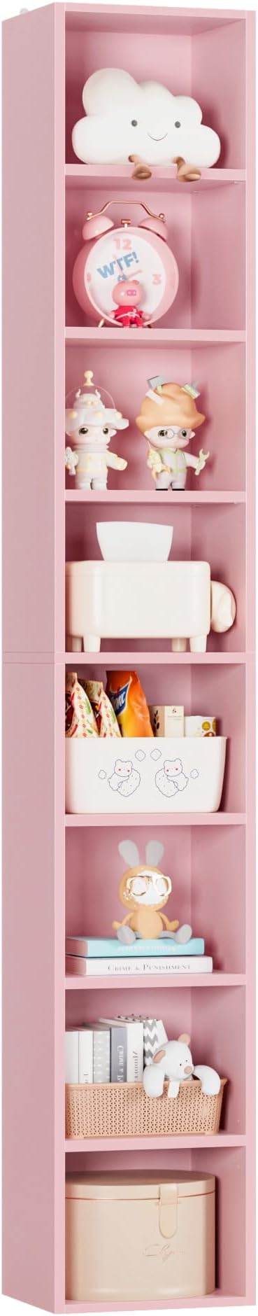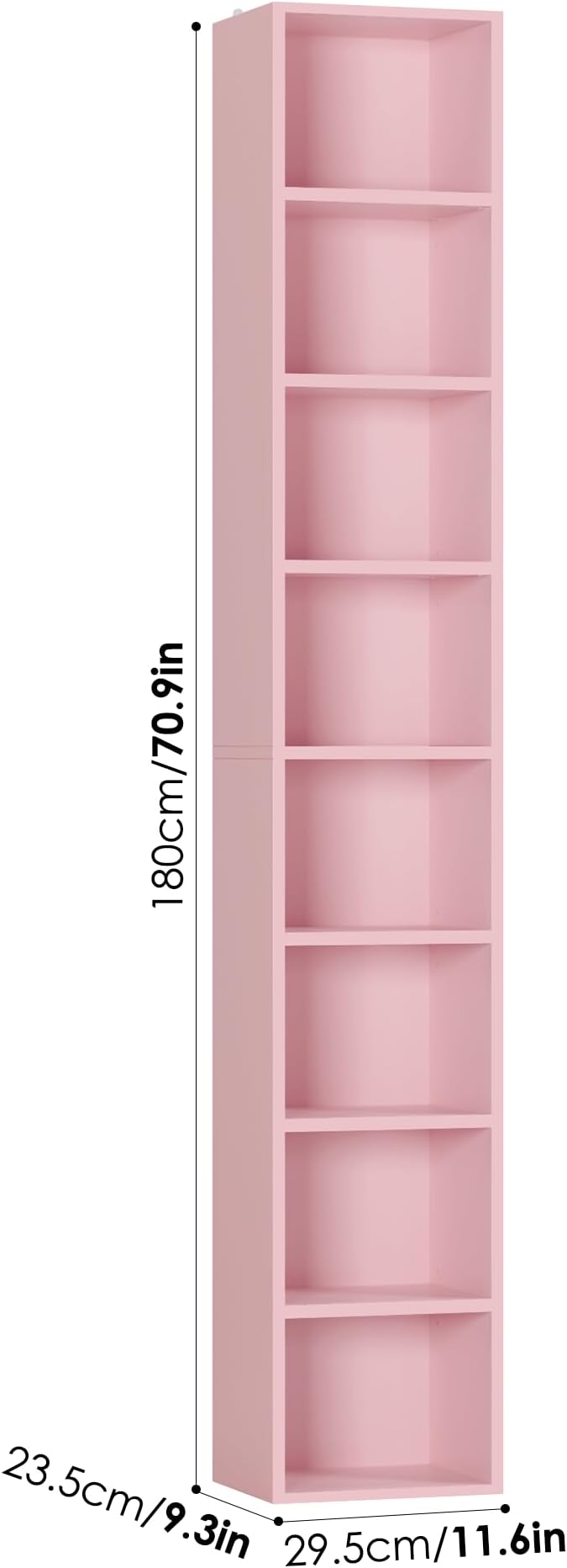 FOTOSOK 8-Tier Media Tower Rack, 11.6 X 9.3 X 70.9 Inches CD DVD Slim Storage Cabinet with Adjustable Shelves, Tall Narrow Bookcase Display Bookshelf for Home Office, Pink
