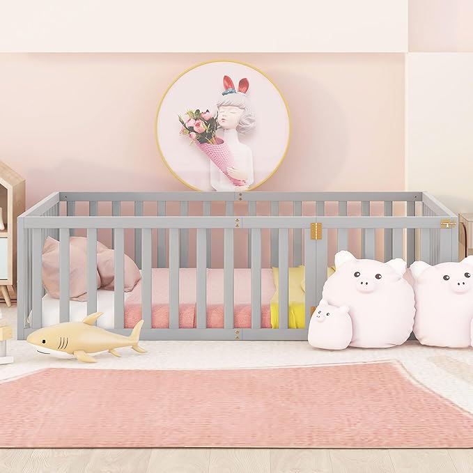Full Size Wood Floor Bed Frame with Fence, Montessori Floor Bed w/Door, Kids Noise Free Beds, No Box Spring Needed, Easy Assembly, for Children, Toddlers, Gray