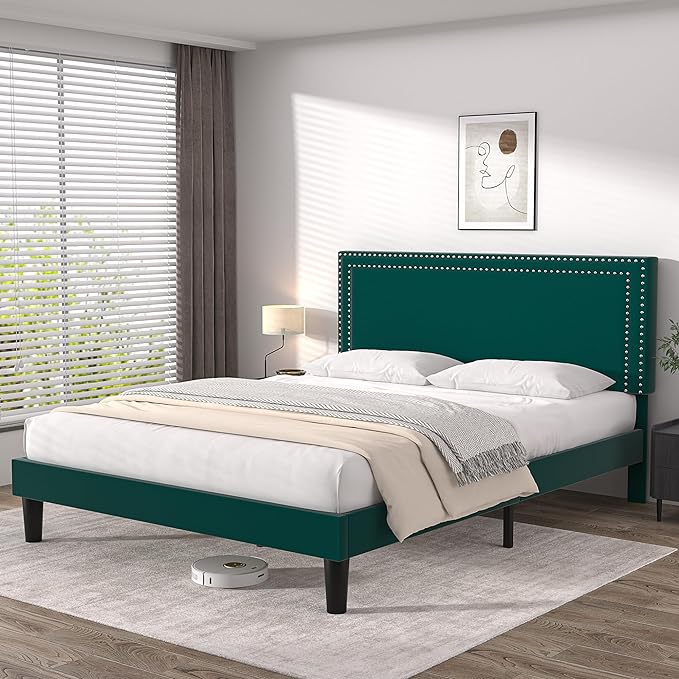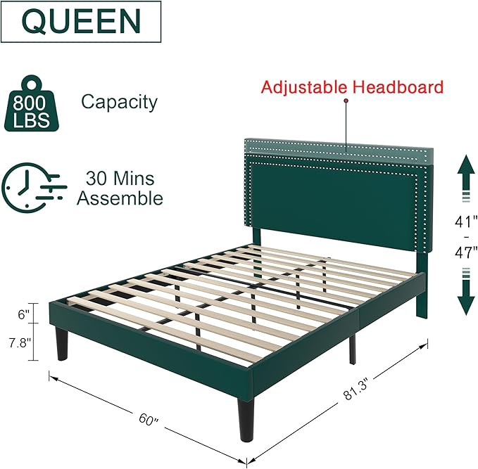 VECELO Queen Size Platform Bed Frame with Height Adjustable Upholstered Headboard, Modern Mattress Foundation,Strong Wood Slat Support, No Box Spring Needed, Easy Assembly