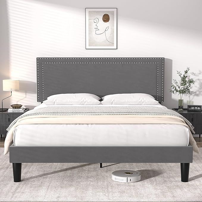 • [NO BOX SPRING NEEDED] - Metal frame and 12 wood slats support platform to extend the life of your mattress, This upholstered bed frame suitable for all kinds of mattresses, spring, memory foam, latex, or hybrid mattress.Max Weight capacity: 700 lbs