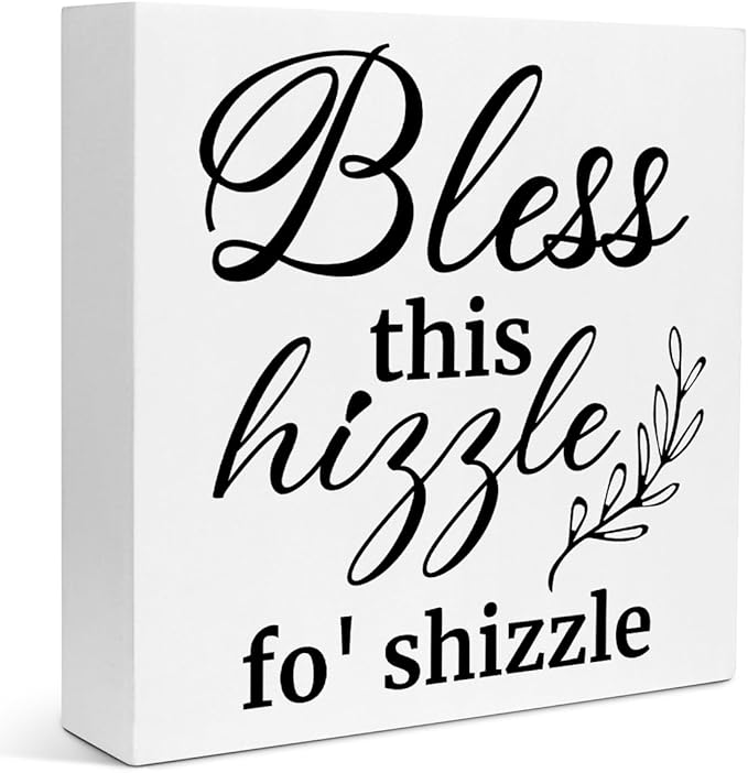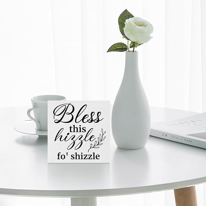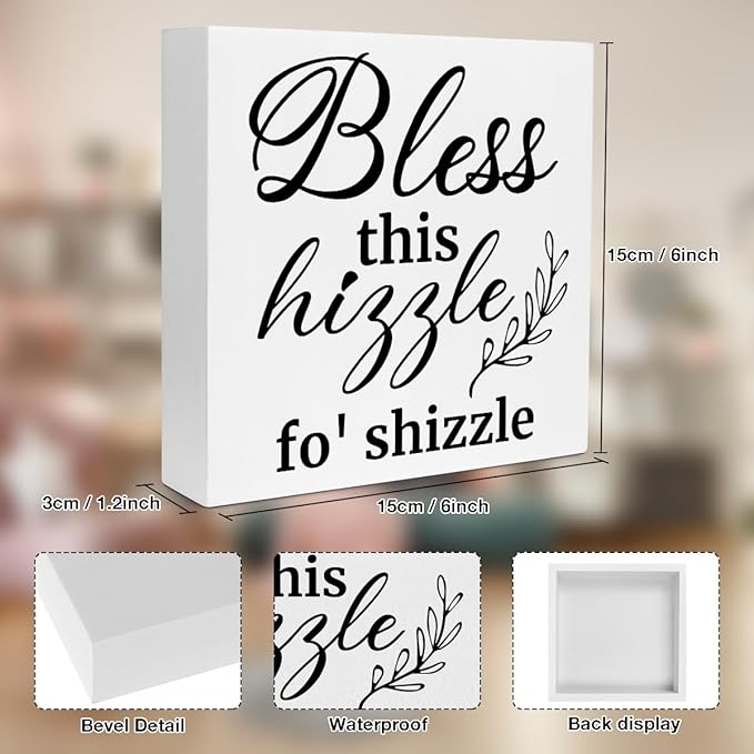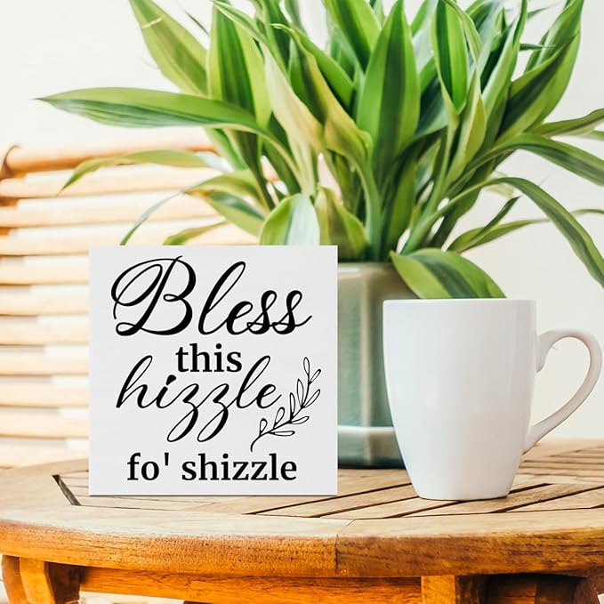 Creoate Bless This Hizzle for Shizzle Box Signs Desk Decor, White Inspirational Wooden Block Sign Shelf Desk Decorations Farmhouse Home Décor Accents Dining Room Living Room Desk Table Decor,
