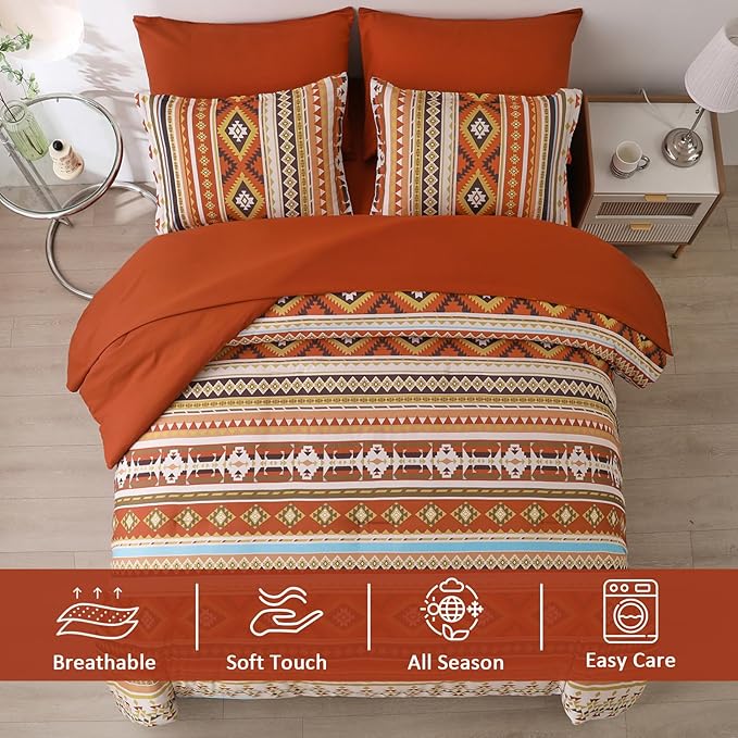Dinjoy Queen Size Comforter Set Boho,Burn Orange Bed in a Bag Queen Striped Bedding Sets Terracotta Western Comforters with Sheets 7 Pieces Complete Set Aztec for All Seasons 90"x90"