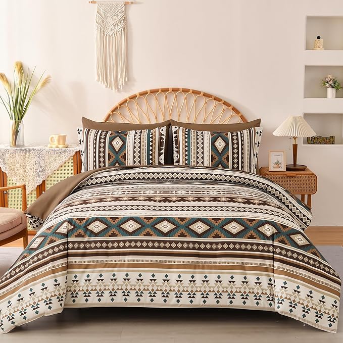 Dinjoy Brown Boho Comforter Set Queen Size,7 Pieces Bed in a Bag Queen Coffee Western Bedding Sets with Sheets Bohemian Geometric Striped Complete Set Aztec for All Seasons Summer 90"x90"