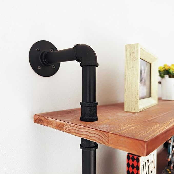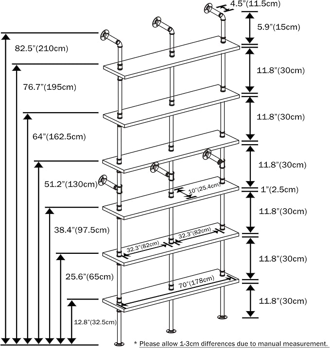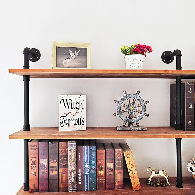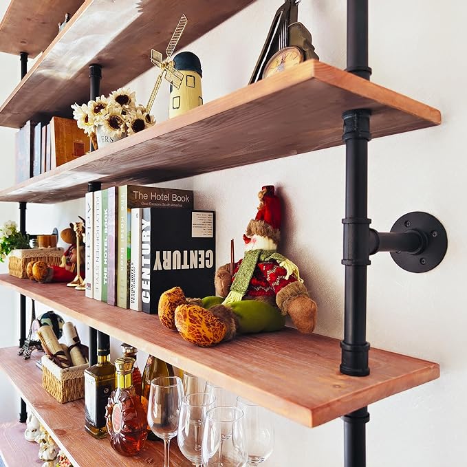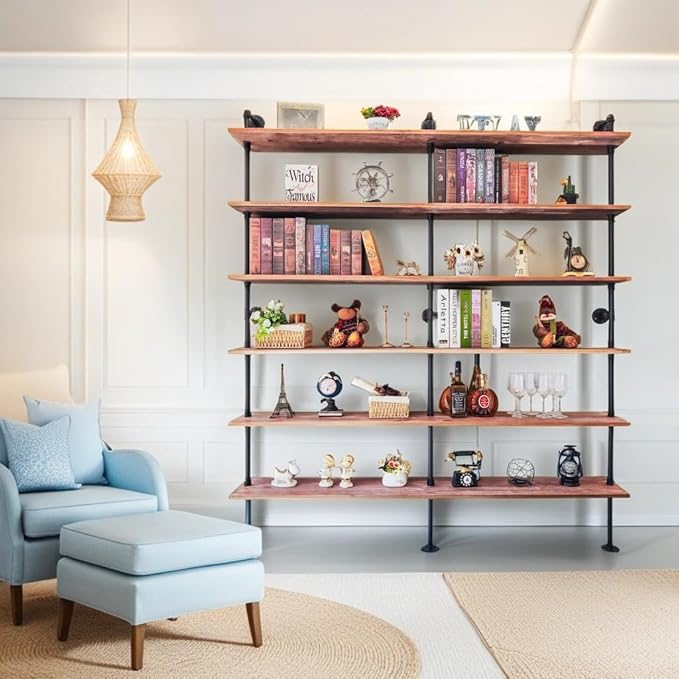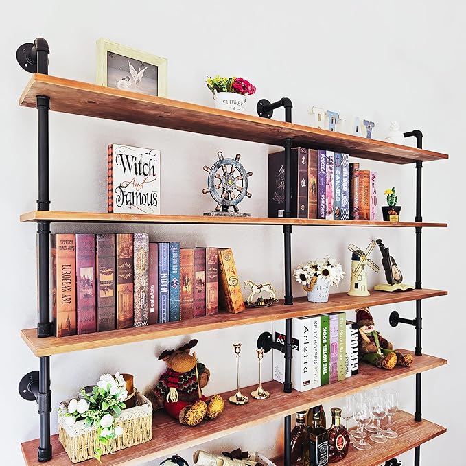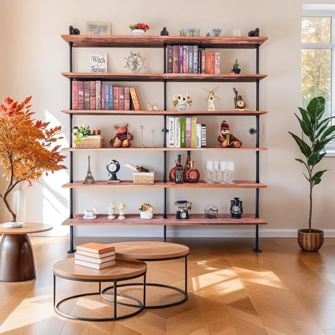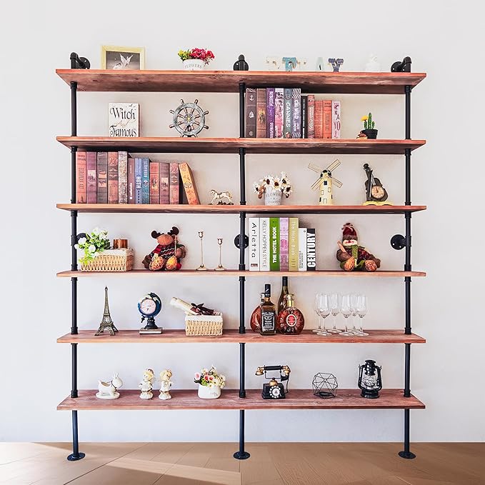 Industrial Ladder Shelf Bookcase, Wall Mounted Rustic Bookshelf, Retro Wood Metal Pipe Industrial Shelves for Living Room(Weathered Brown, 6 Tier - 10" D x 70" W x 82.5" H)