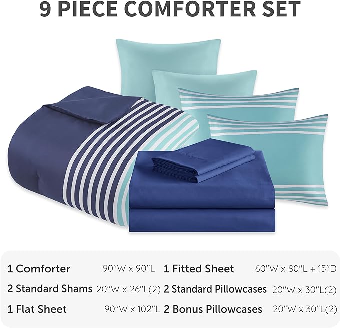 Comfort Spaces Queen Comforter Sets with Sheets - Bed in a Bag 9 Pieces Teen Bedding Sets Queen, Navy and Grey Stripes Bedding Queen, College Queen Bed Set, 2 Side Pocket Bedroom Organizer Queen Navy