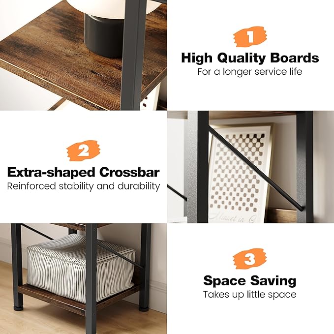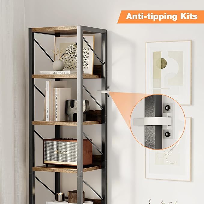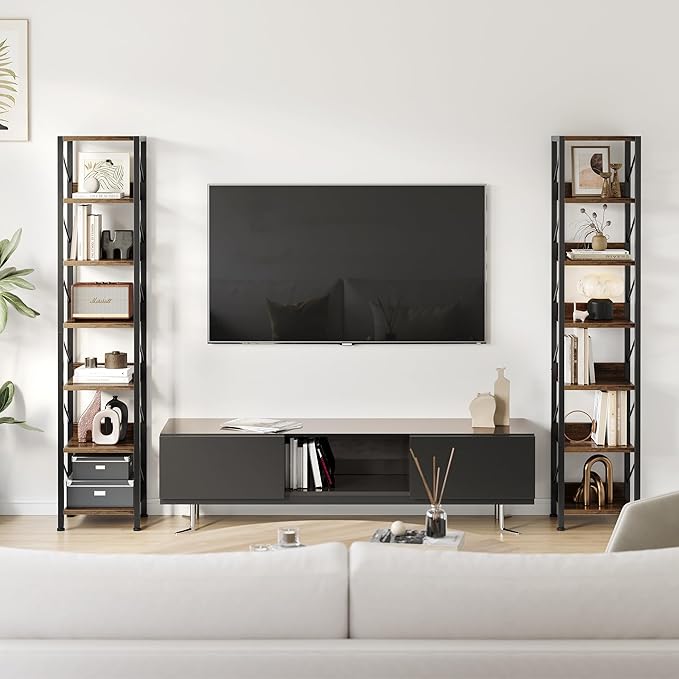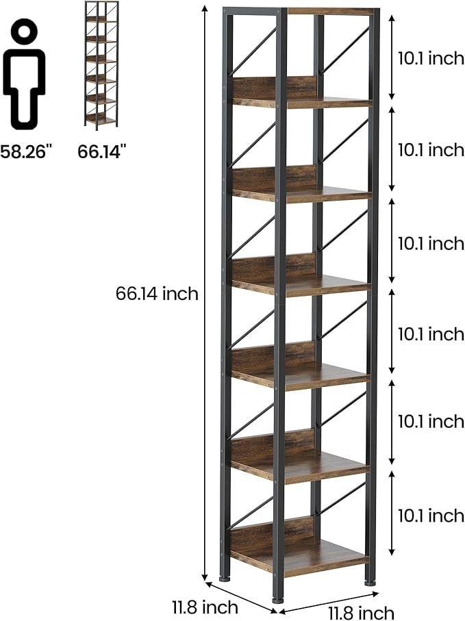 IDEALHOUSE Narrow Bookshelf Tall Skinny Bookcase 6 Tier Storage Rack Rustic Corner Shelf Metal Frame Small Freestanding Bookshelves Industrial Display Stand for Bedroom, Living Room, Home Office