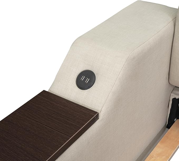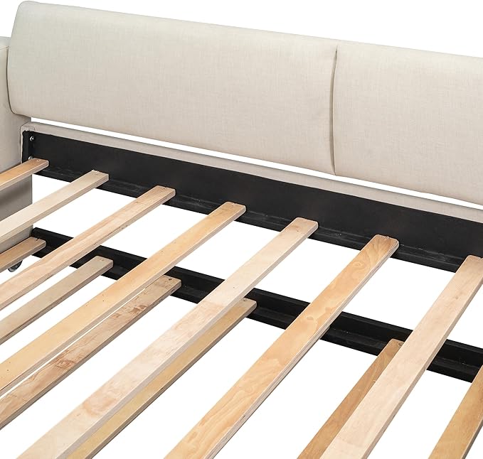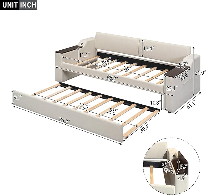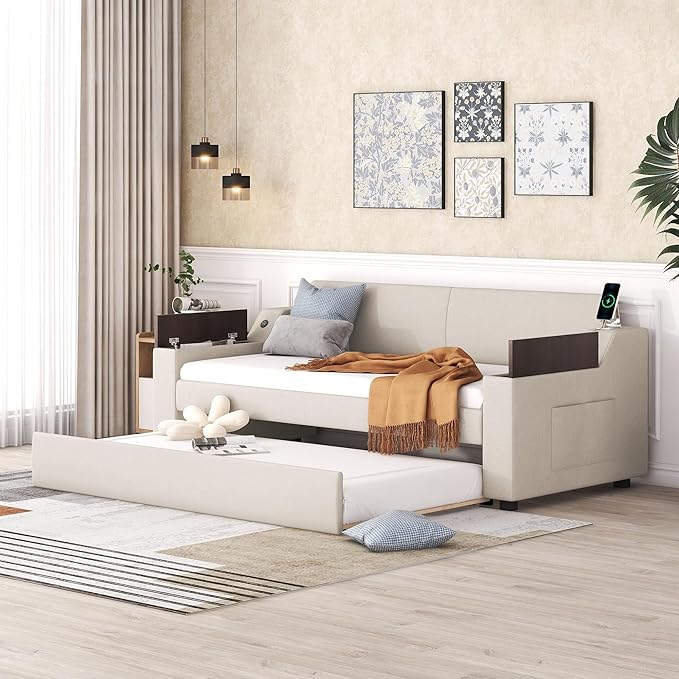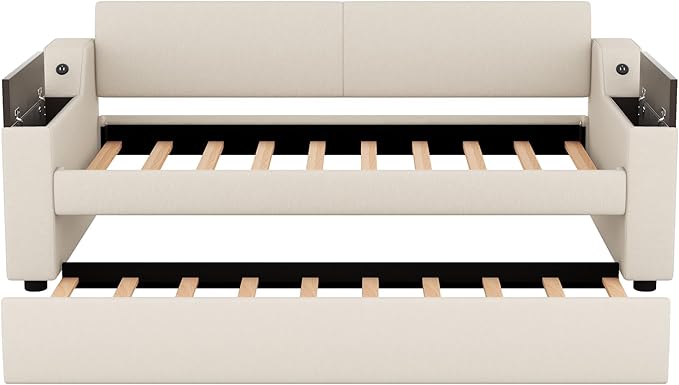 Upholstered Size Upholstery Trundle, Daybed Sofa Bed Frame with Storage Arms & USB Charging Design for Living Room Bedroom, Beige, Twin XL