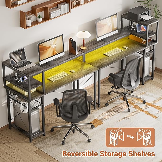 47" Gaming Desk with Storage, Computer Desk with LED Lights, Home Office Desk with Adjustable Shelves & Power Outlets, Gaming Computer Desk with Long Monitor Stand
