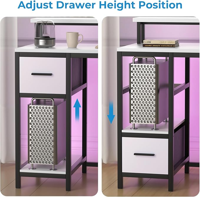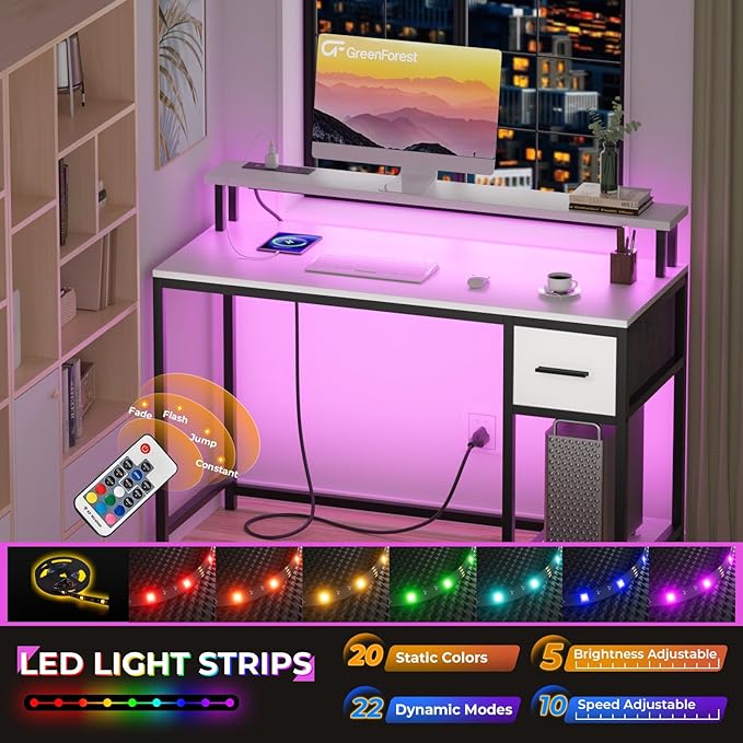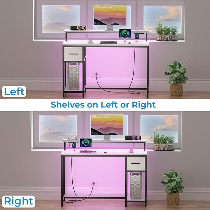 GreenForest Computer Desk with Drawers 39 inch,Gaming Desk with LED Lights & Power Outlets Small Desk with Monitor Stand and Reversible Shelf,White