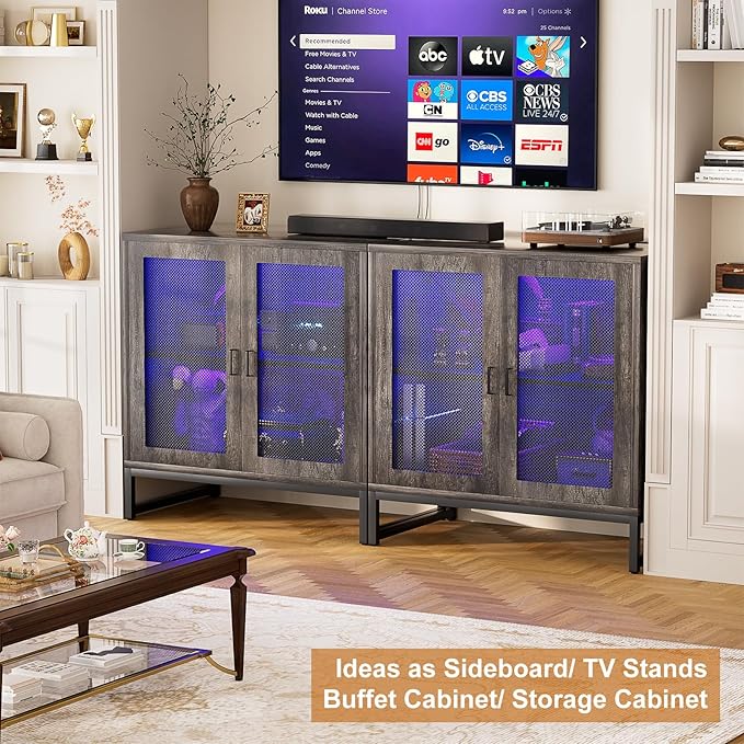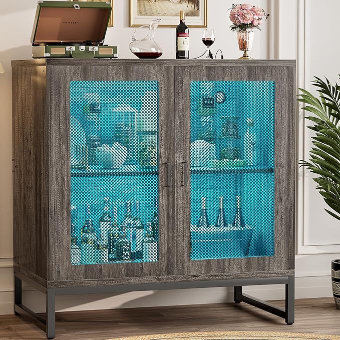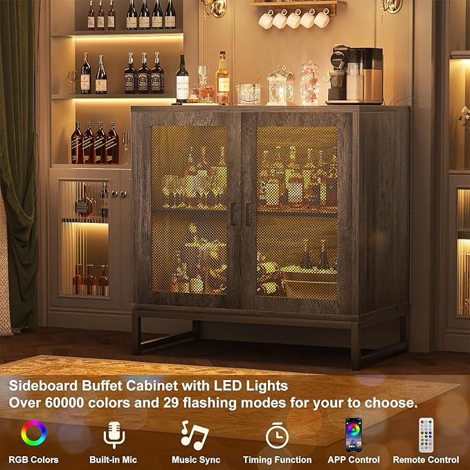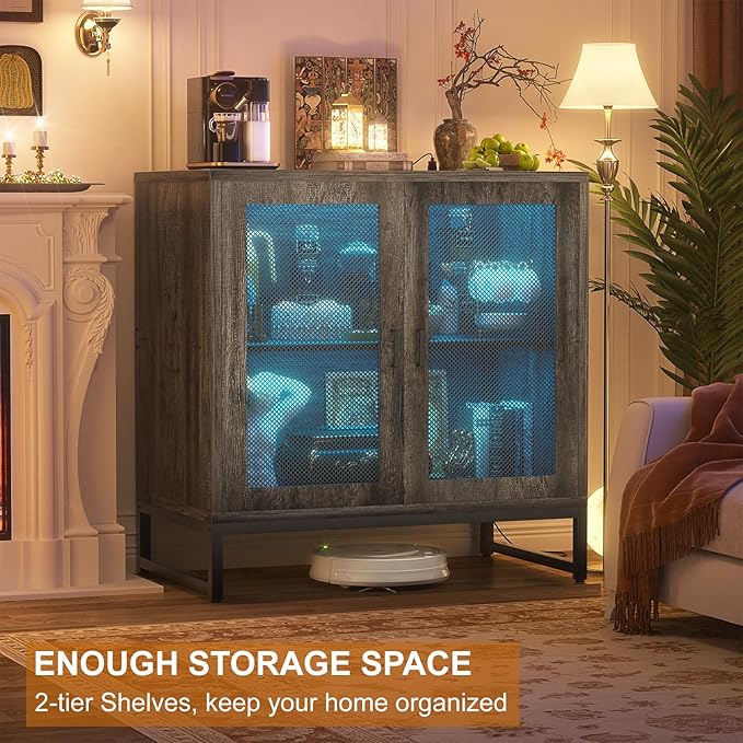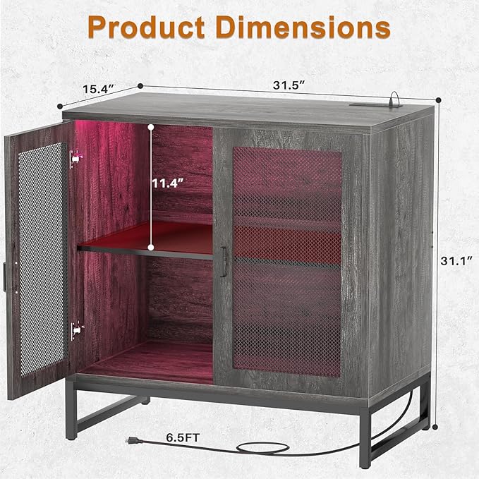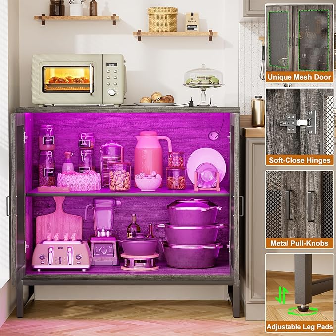 Aheaplus Sideboard Buffet Cabinet with Power Outlet, Accent Cabinet with Storage & LED Lights, Small Storage Cabinet Cupboard Console Cabinet for Kitchen, Hallway, Entryway, Living Room, Grey Oak