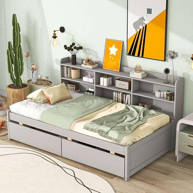 Twin Size Platform 2 Storage Drawers and Side Bookcase, Solid Wood Day Captain, Ideal Bed Frame for Bedroom, Living Room, Gray