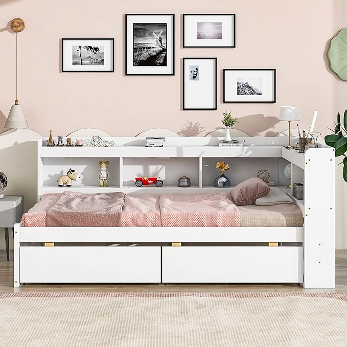 Twin Size Platform 2 Storage Drawers and L-Shaped Bookcases, Wooden Captain Bed Daybed Frame with Headboard for Bedroom, Living Room, White