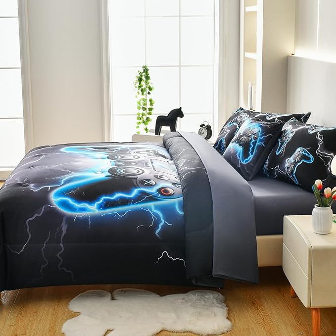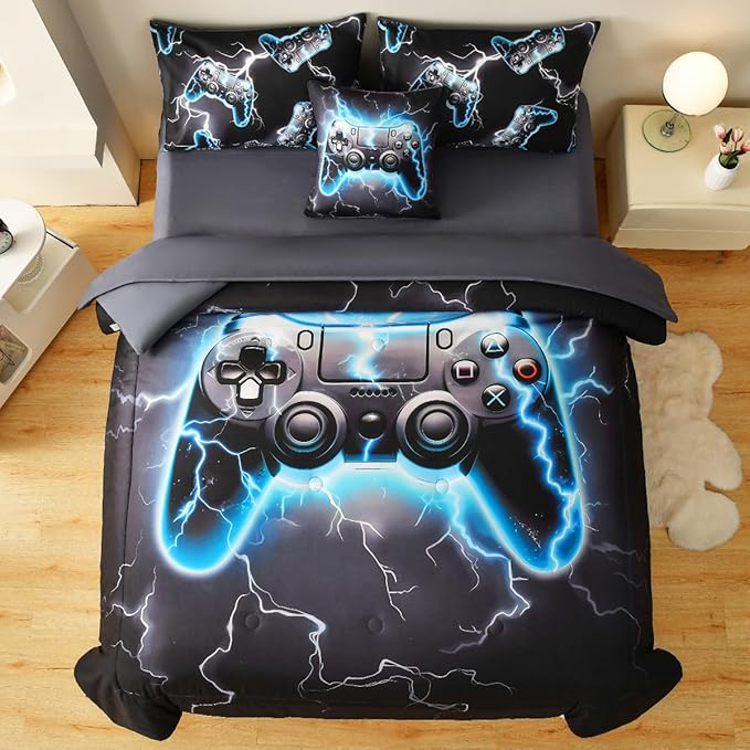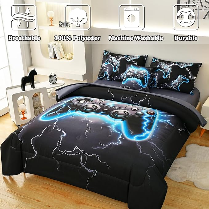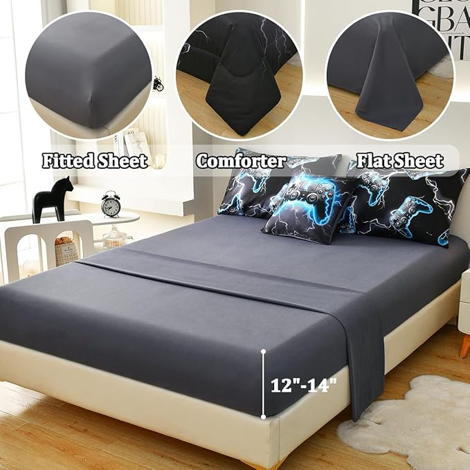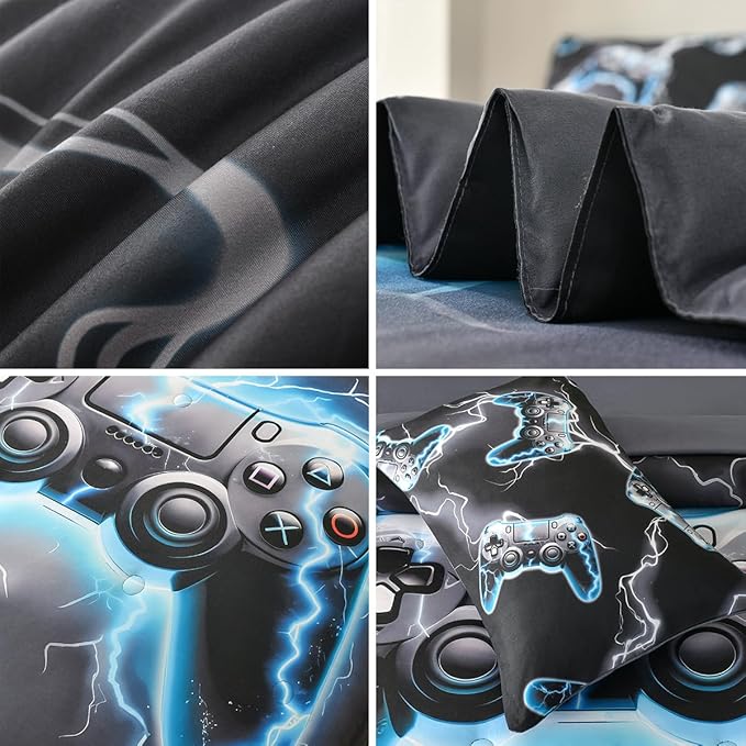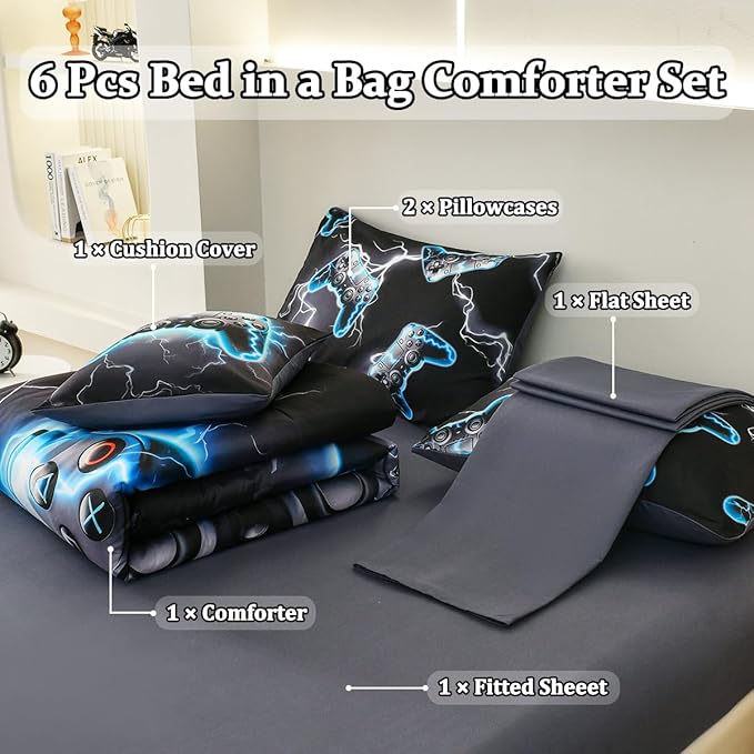 Game Console Twin Comforter Set with Sheets, Microfiber 6 Pcs Bed in A Bag Twin Size Gamer Bedding Set for Boys Kids Teens