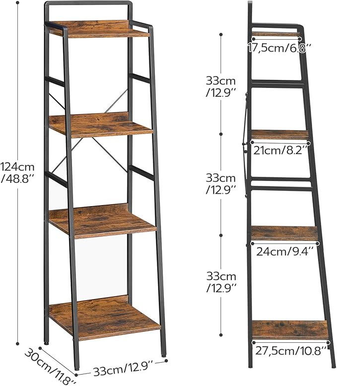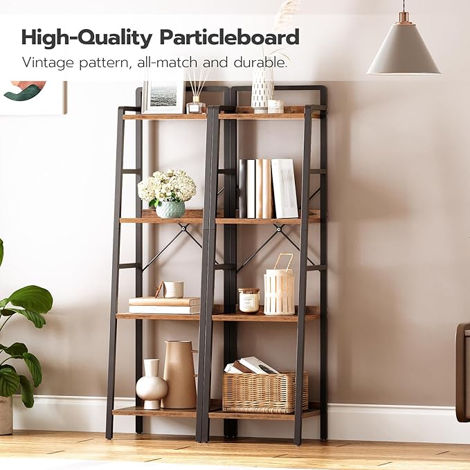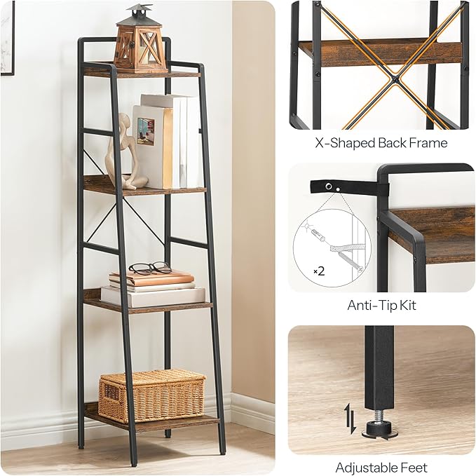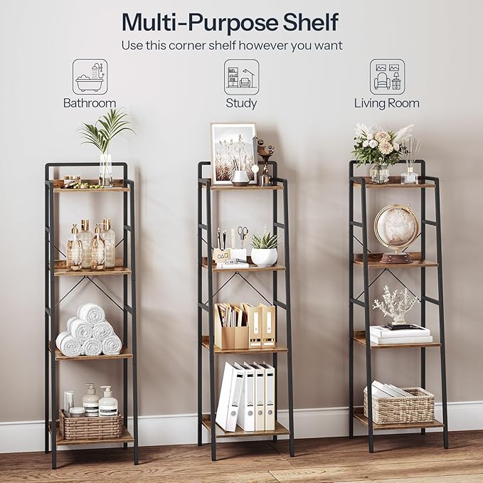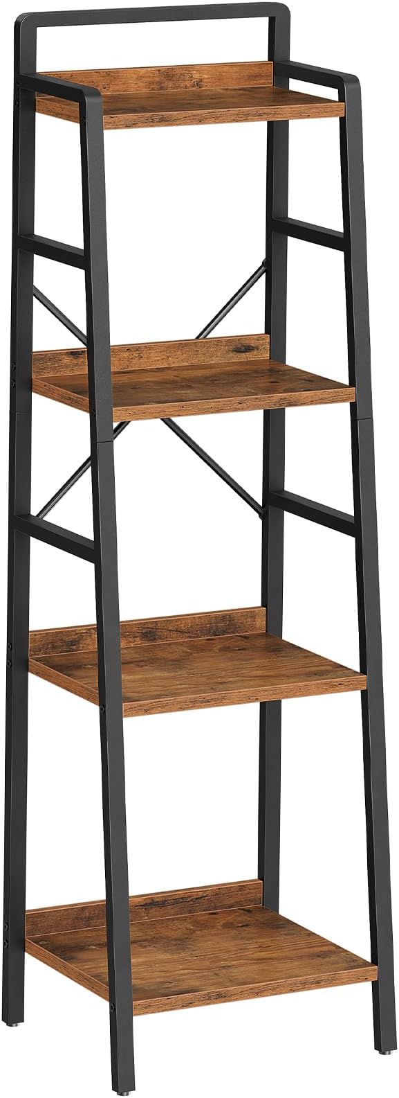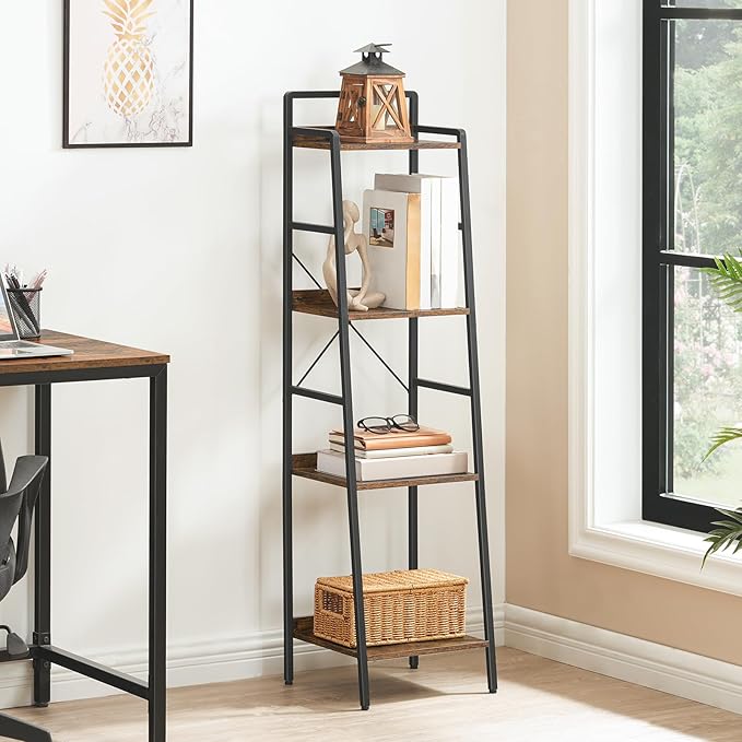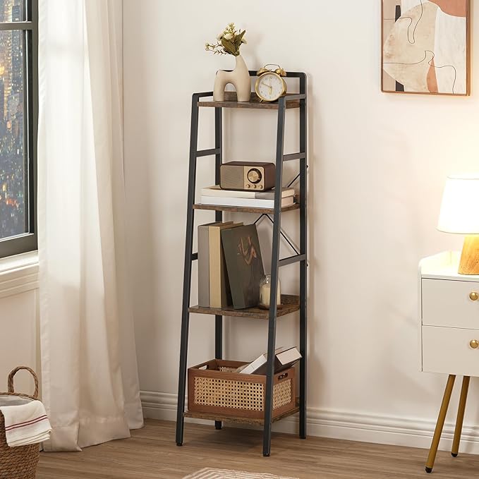 HOOBRO Bookcase, 4-Tier Narrow Bookshelf, Industrial Ladder Shelf, Skinny Bookshelf for Small Spaces, Corner Storage Shelf for Home Office, Living Room, Rustic Brown and Black BF34SJ01