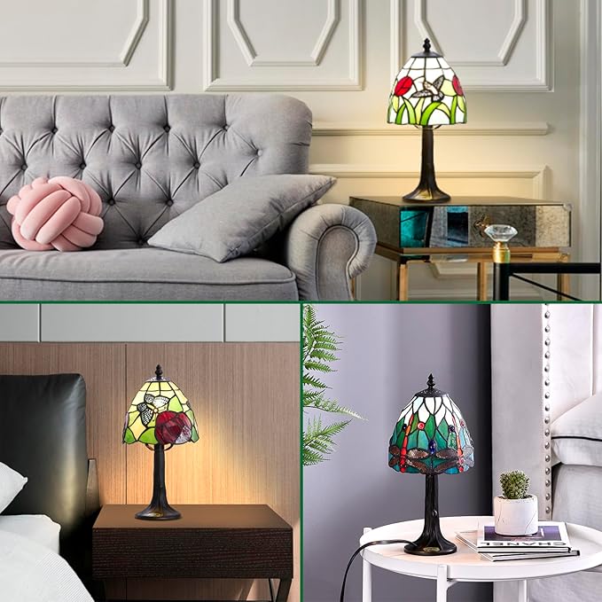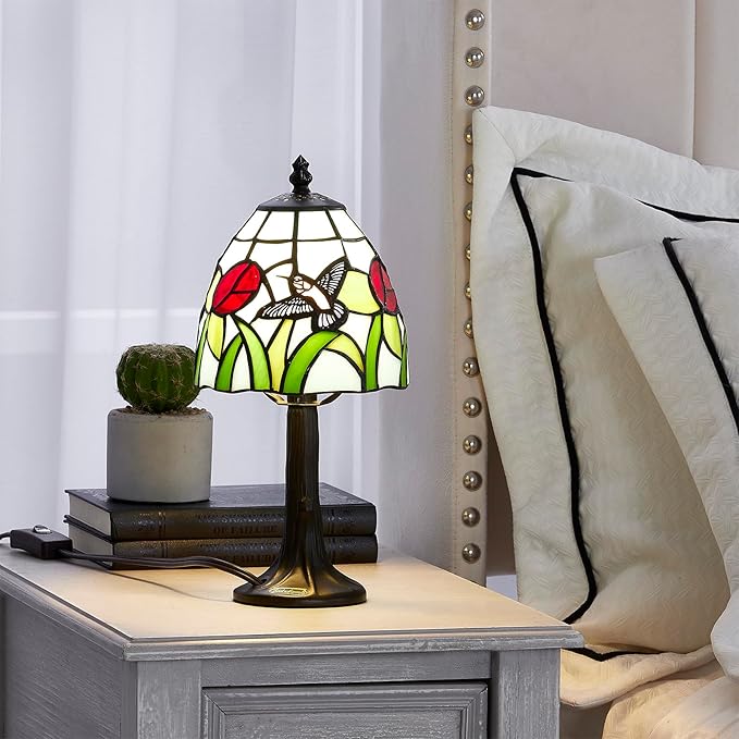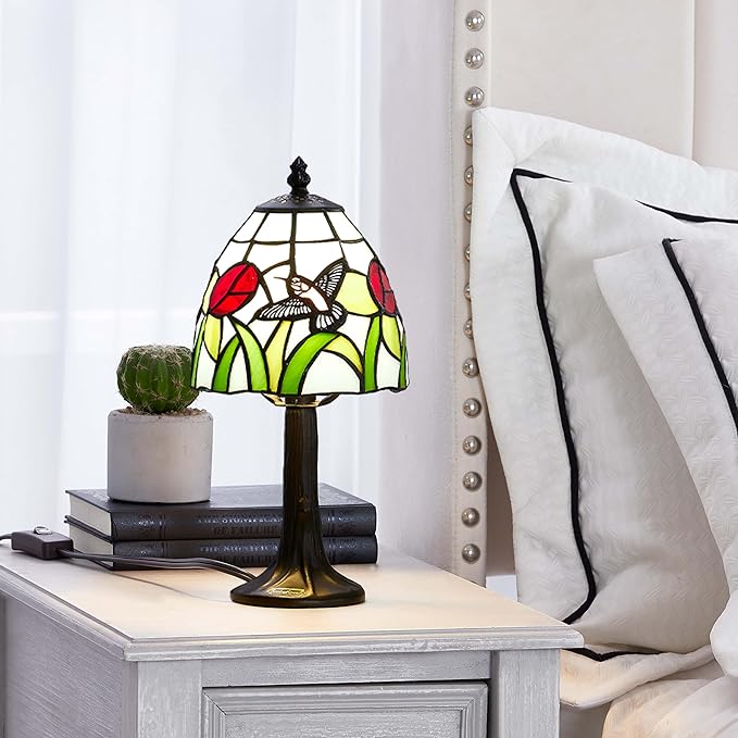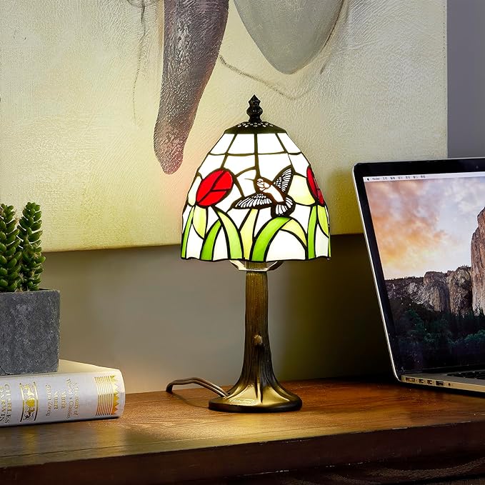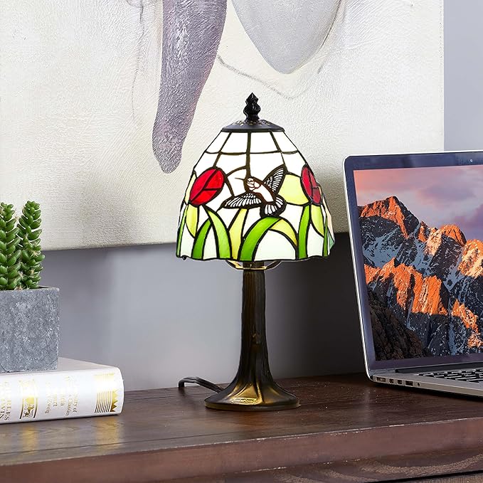 Tiffany Style mini table Lamp-Stained Glass Hummingbird with Tulip Design Table or Desk Light LED Bulb Included-Vintage Look Colorful Accent Decor