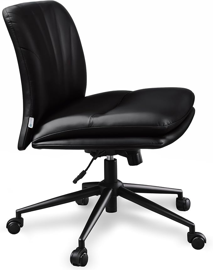 Criss Cross Chair with Wheels - Cross Legged Office Chair, Wide Armless Desk Chair Comfy Swivel Vanity Chair for Home Office, PU Leather - Black