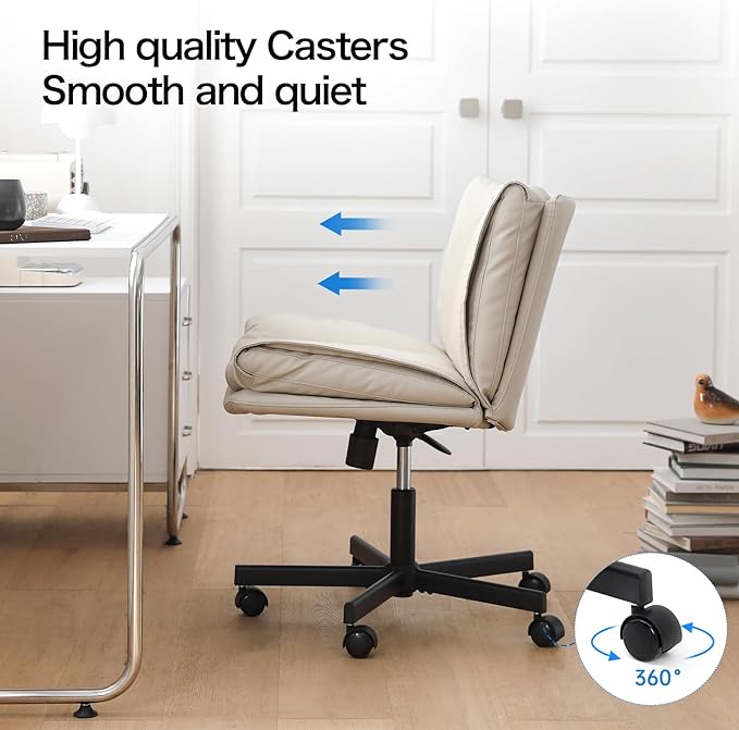 LEAGOO Armless Desk Chair, Office Chair with Wheels, PU-Leather Desk Chair, Modern Swivel Height Adjustable Office Chair with Wide Seat for Home, Office, Make Up, Bed Room - Beige