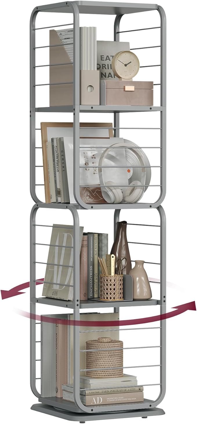 VASAGLE 4-Tier Rotating Bookshelf, Bookcase with Bookends for Small Spaces, Corner Shelf, Steel Frame, Dove Grey ULLS127G36