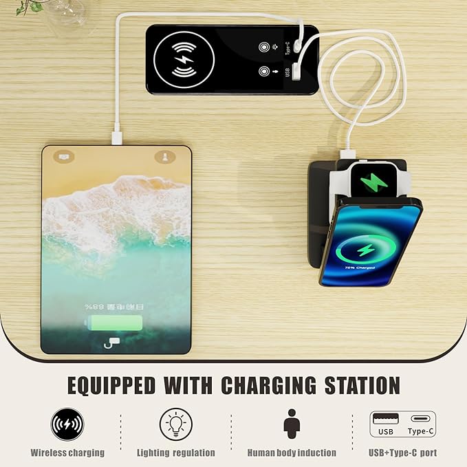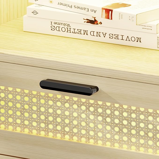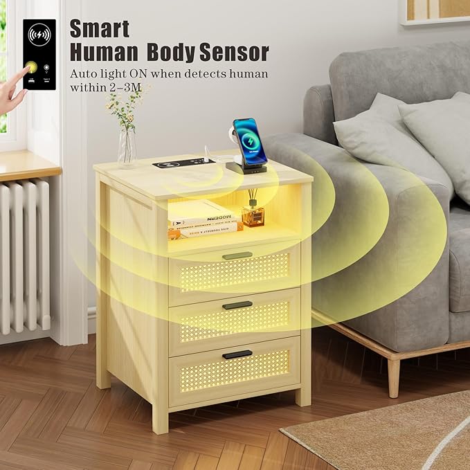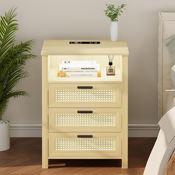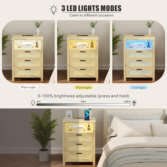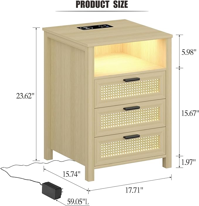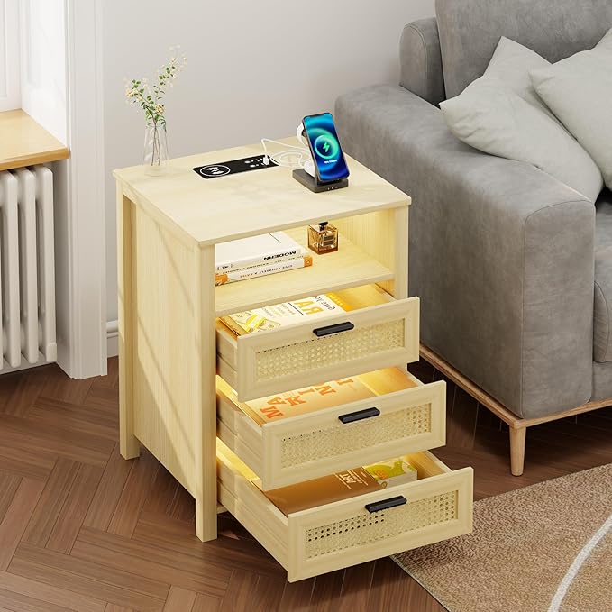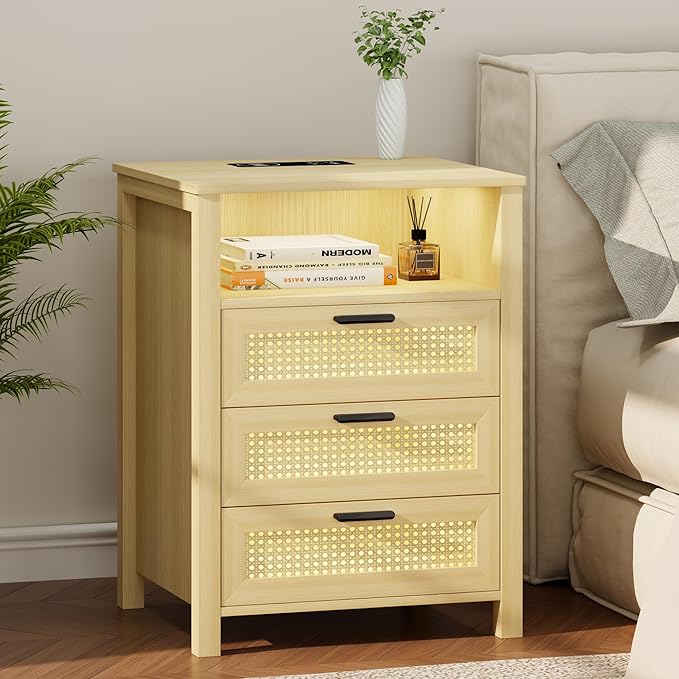 Rattan Nightstand with Charging Station, Night Stand with 3 Drawers and Open Shelf, Bed Side Table with LED Lights for Bedroom, Living Room, Natural Wood