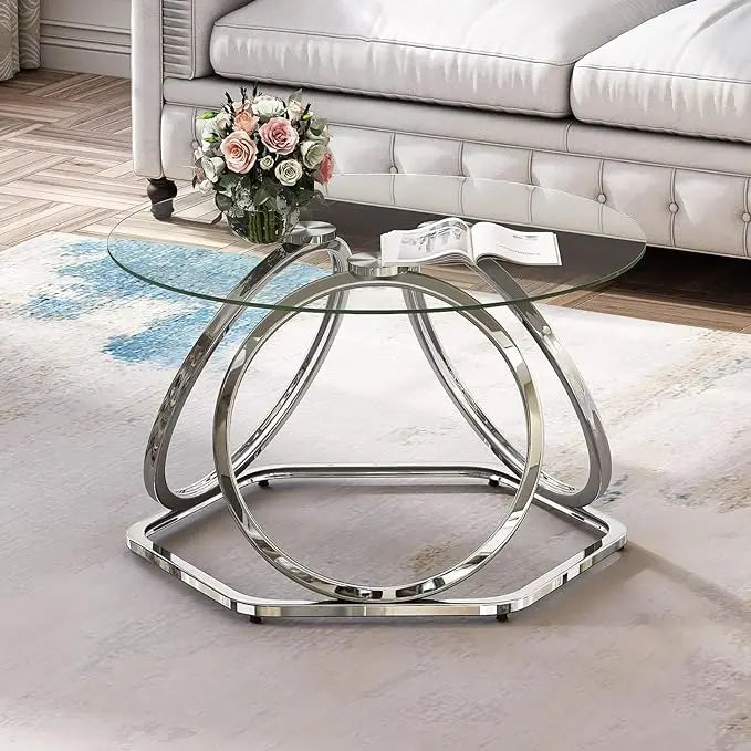 O&K FURNITURE Glass Coffee Table, Modern Silver Coffee Table Living Room Table with Hexagonal Base, Round Coffee Table for Home&Office, Chrome Finish, 1 PC