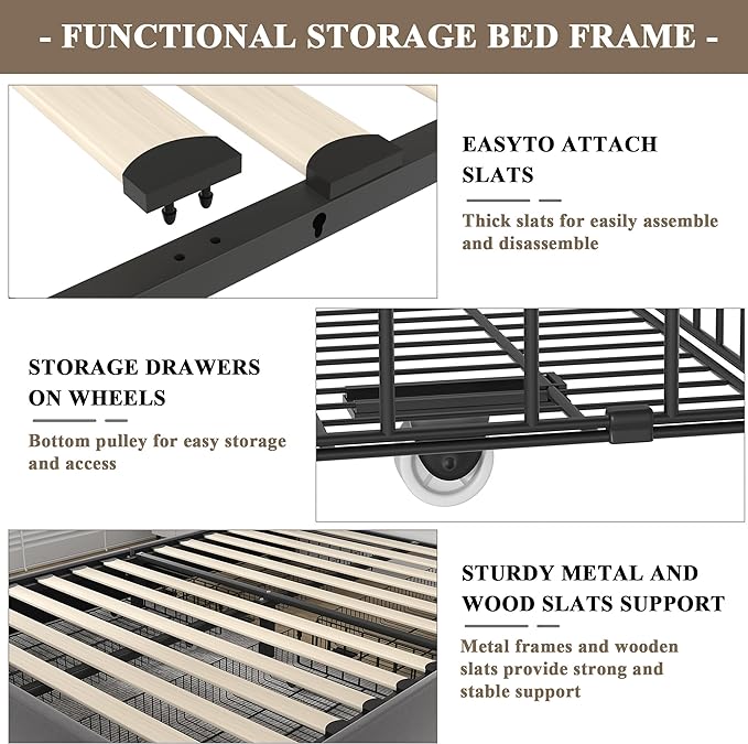 About This Wood & Metal [Bed Frame with 4 Storage Drawers]--The bed frame with 4 storage drawers features easy-to-use wheels...