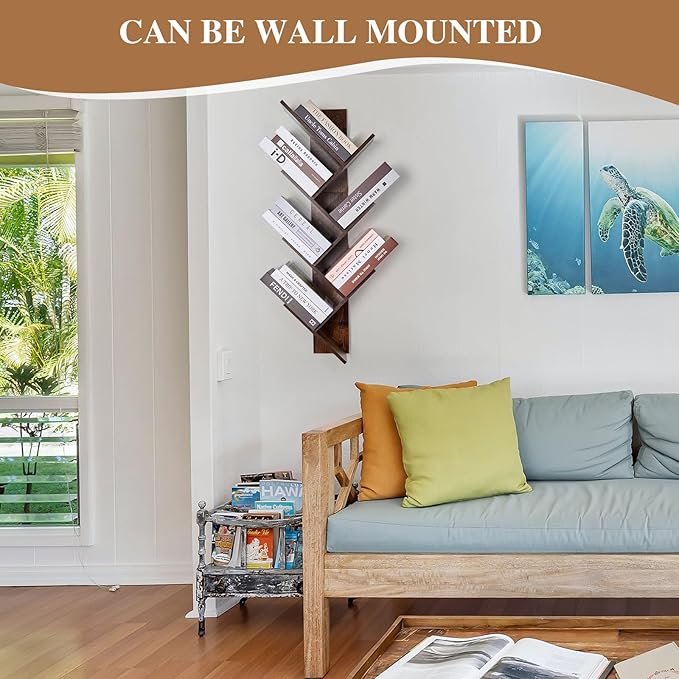 Tree Bookshelf 6 layers with drawers Retro Book Holder Rustic Brown Wooden Floor Standing Bookshelf for Living Room,Bedroom,Home Office Modern Bookcase