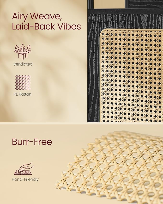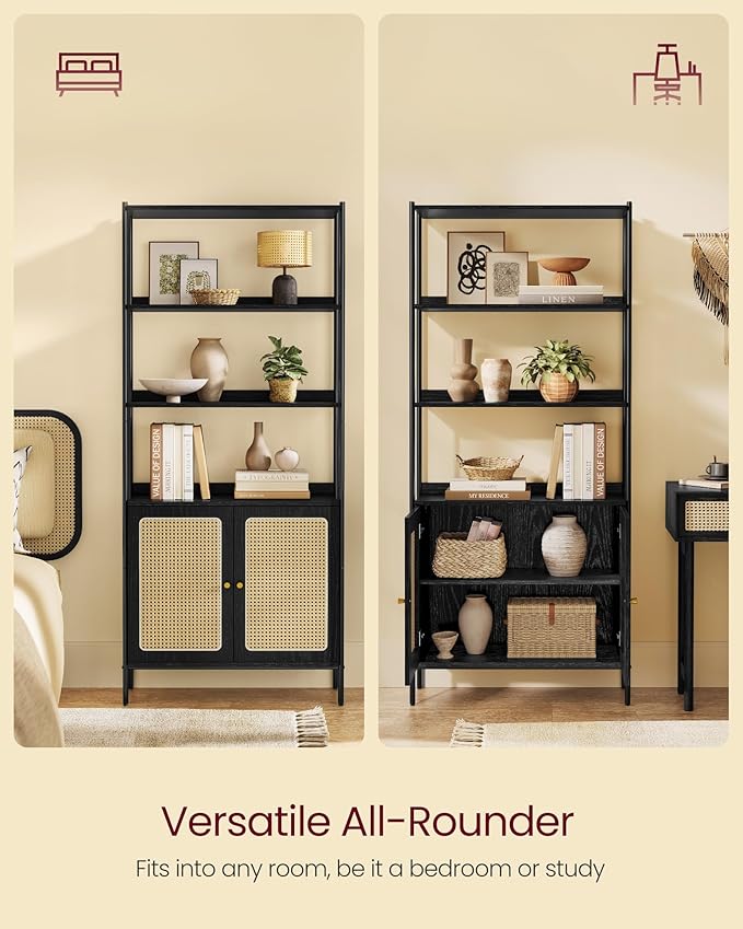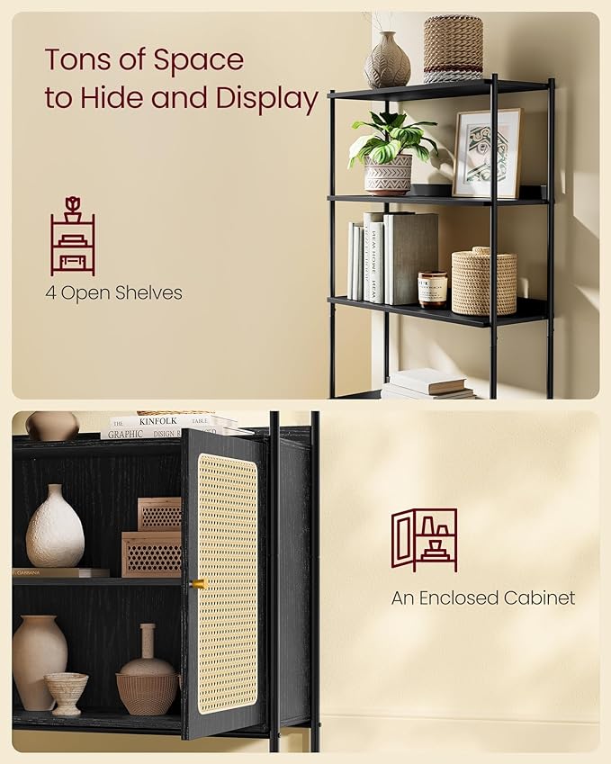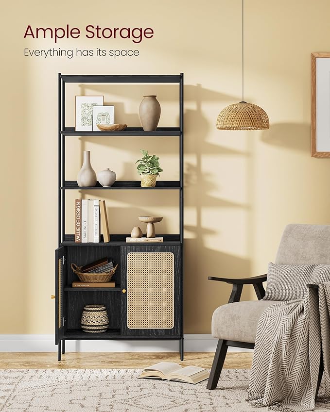 VASAGLE 6-Tier Bookcase, Bookshelf with Rattan-Like Door, Boho Style, Freestanding 30.1-Inch Wide Storage Shelf, Metal Frame, Adjustable Shelf, for Living Room, Ebony Black and Matte Black ULLS124B56