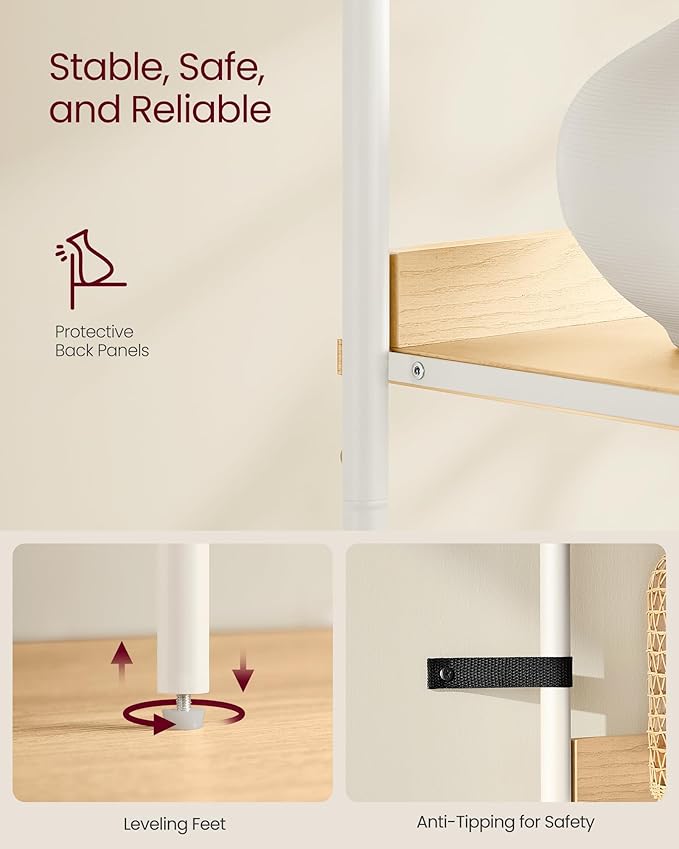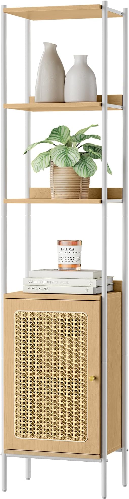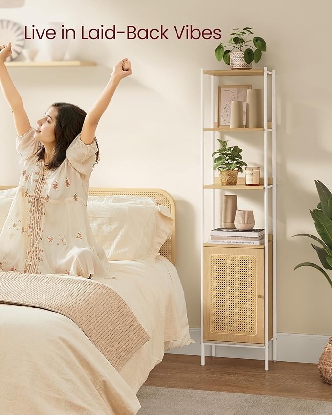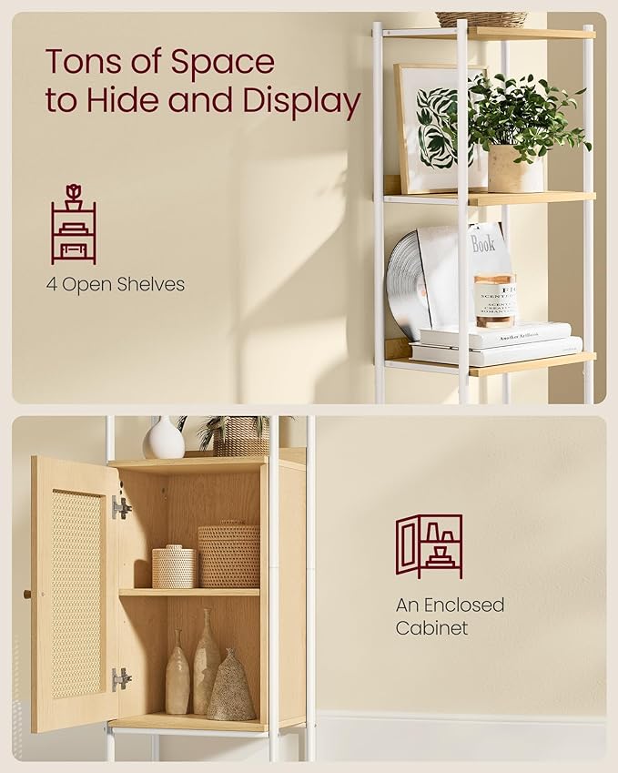 VASAGLE 6-Tier Bookcase, Bookshelf with Rattan-Like Door, Boho Style, Freestanding 15.7-Inch Wide Storage Shelf, Metal Frame, Adjustable Shelf, for Living Room, Oak Beige and Pearl White ULLS122W57