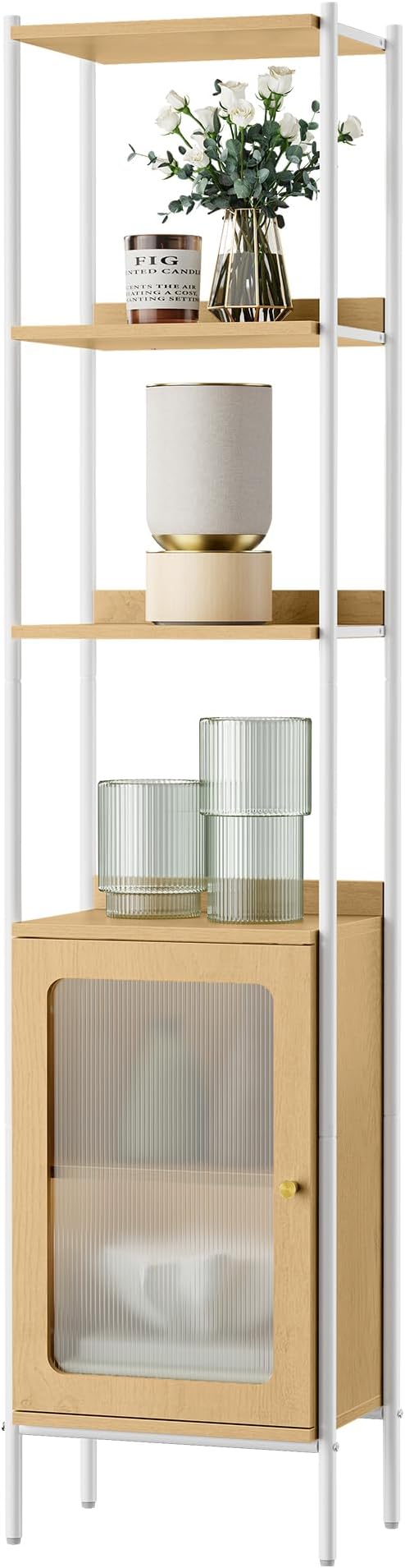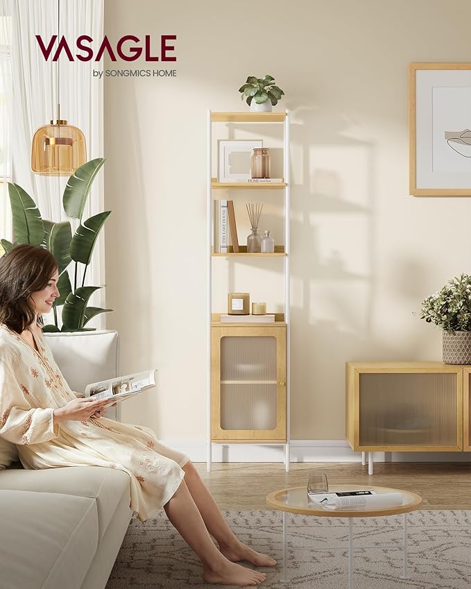 VASAGLE 6-Tier Bookcase, Slim Bookshelf with PC Door, Freestanding Storage Shelf with Metal Frame, Adjustable Shelf, for Living Room, Oak Beige and Pearl White ULLS123W57