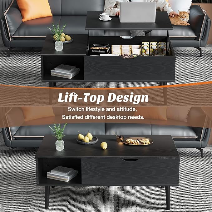 Sweetcrispy Coffee Table, Lift Top Coffee Tables for Living Room, Small Rising Wooden Dining Center Tables with Hidden Storage Compartment, Black